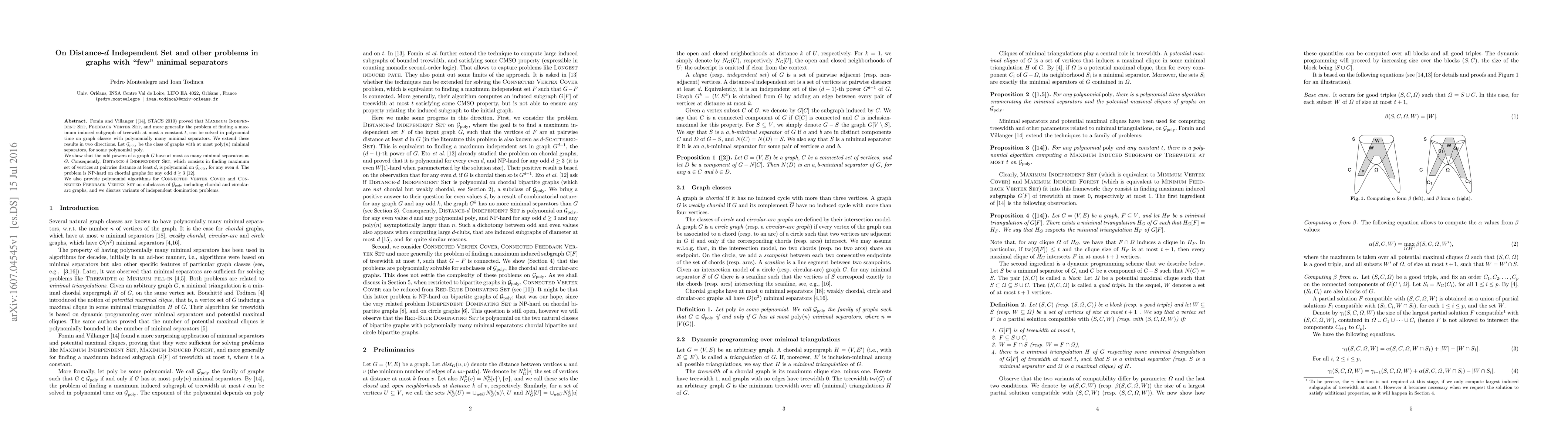 This paper extends the polynomial-time solvability of several graph problems to graph classes with polynomially many minimal separators. It shows that \textsc{Distance-$d$ Independent Set} is polynomial on such graphs for even $d$, while being NP-hard for odd $d \geq 3$ on chordal graphs. Additionally, it provides polynomial algorithms for Connected Vertex Cover and Connected Feedback Vertex Set on subclasses including chordal and circular-arc graphs.