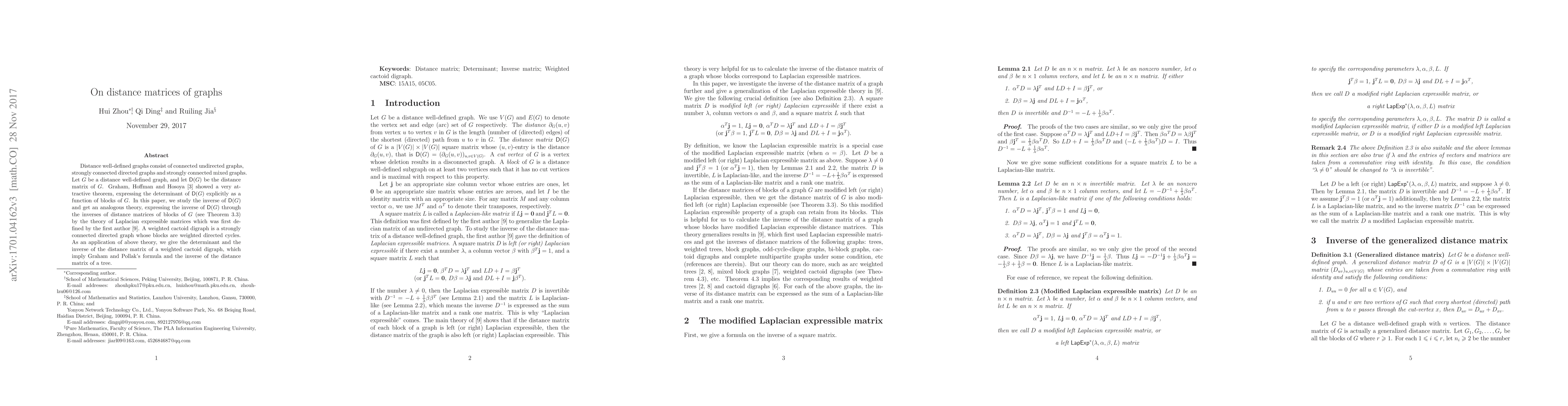 This paper develops a theory for the inverse of distance matrices in graphs, providing an analogous expression to Graham's formula for determinants, with implications for understanding strongly connected directed graphs and their applications.