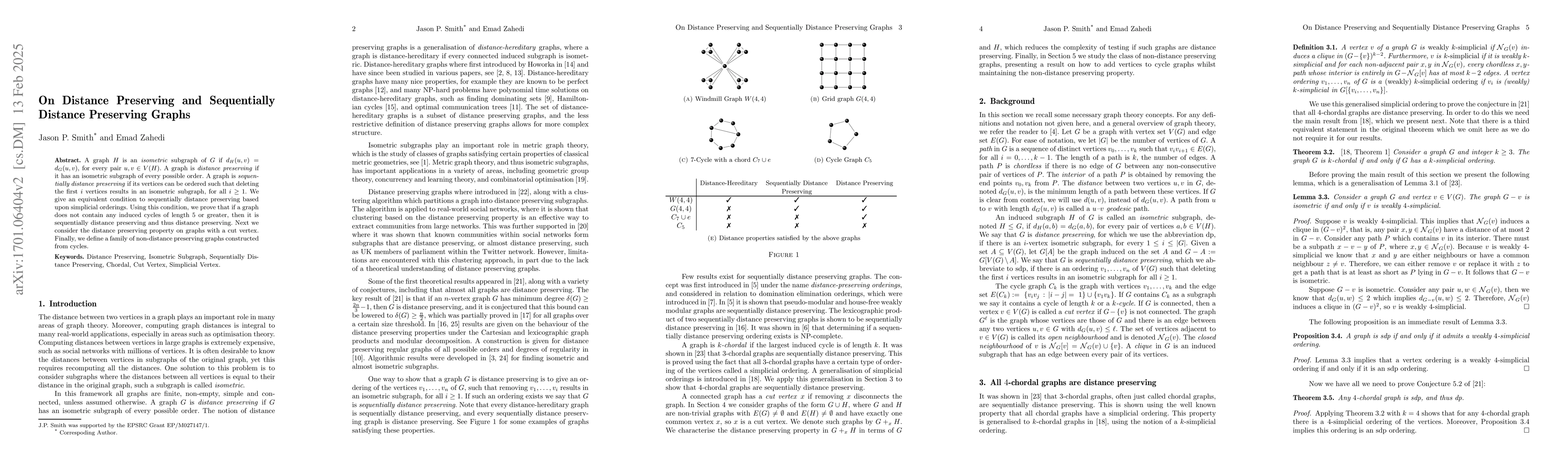 This paper explores distance preserving and sequentially distance preserving graphs, providing an equivalent condition for the latter based on simplicial orderings. It proves that graphs without induced cycles of length 5 or greater are sequentially distance preserving and thus distance preserving. It also examines the distance preserving property in graphs with a cut vertex and constructs a family of non-distance preserving graphs from cycles.