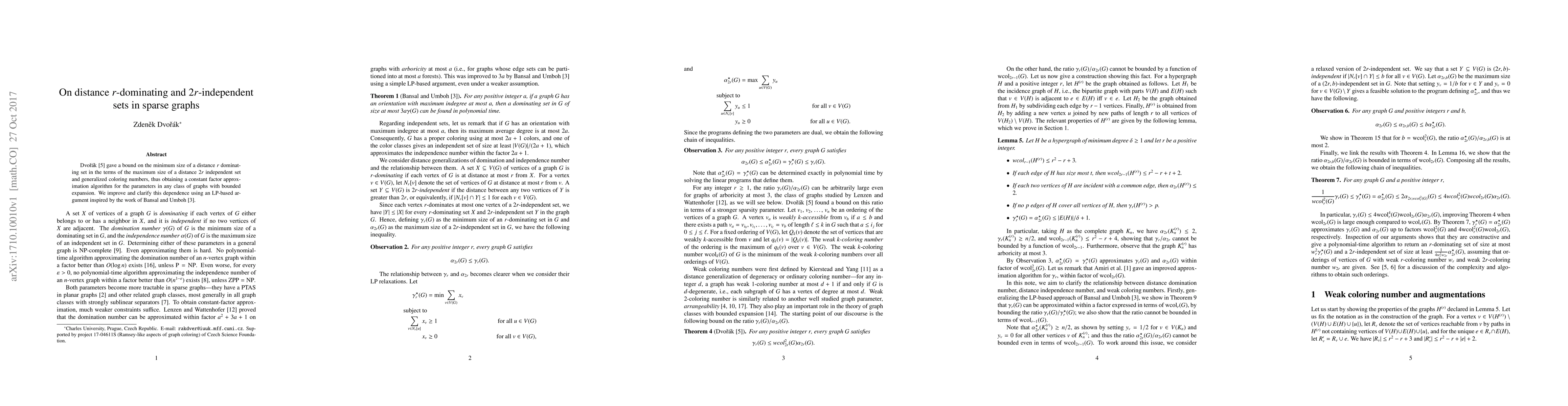 Summary: The paper improves Dvorak's (2013) bound on distance r-dominating sets by using an LP-based argument, providing a clearer relationship between distance r-dominating sets and distance 2r-independent sets in sparse graphs with bounded expansion. This leads to a refined constant factor approximation algorithm.