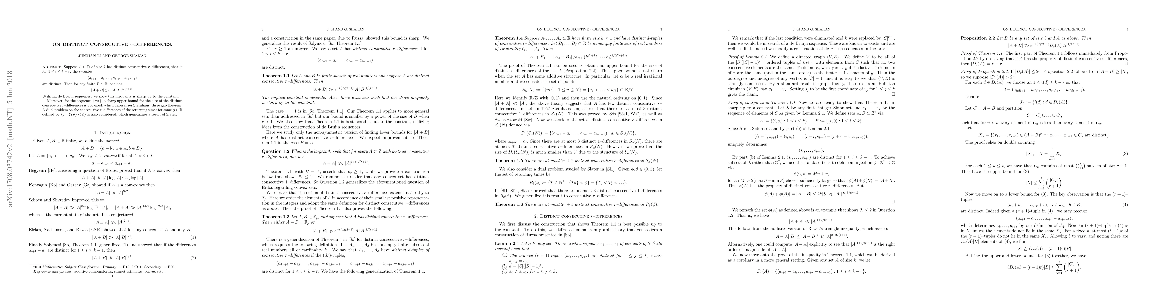 Suppose $A\subset \mathbb{R}$ of size $k$ has distinct consecutive $r$--differences, that is for $1 \leq i \leq k -r$, the $r$--tuples $$(a_{i+1} - a_i , \ldots , a_{i+r} - a_{i + r -1})$$ are distinct. Then for any finite $B \subset \mathbb{R}$, one has $$|A+B| \gg_r |A||B|^{1/(r+1)}.$$ Utilizing de Bruijn sequences, we show this inequality is sharp up to the constant. Moreover, for the sequence $\{n\alpha\}$, a sharp upper bound for the size of the distinct consecutive $r$--differences is obtained, which generalizes Steinhaus' three gap theorem. A dual problem on the consecutive $r$--differences of the returning times for some $\phi \in \mathbb{R}$ defined by $\{T : \{T\theta\}<\phi\}$ is also considered, which generalizes a result of Slater.