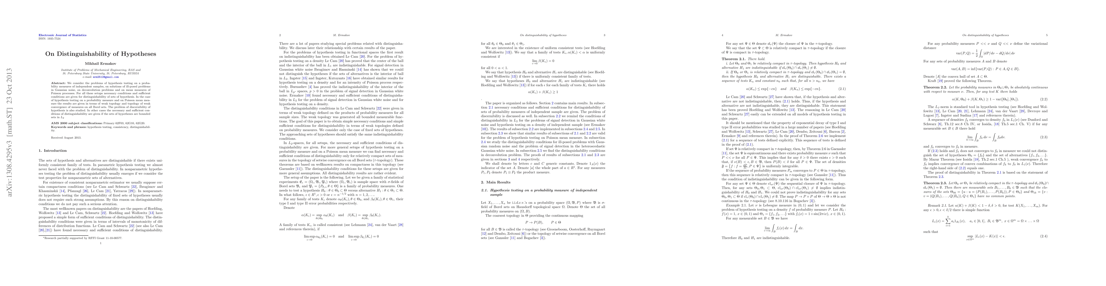 We consider the problems of hypothesis testing on a probability measure of independent sample, on solution of ill-posed problem, on deconvolution problem and on Poisson mean measure. For all these setups necessary conditions and sufficient conditions are given for distinguishability of sets of hypothesis. In the case of hypothesis testing on a probability measure and on Poisson mean measure the results are given in terms of weak topology and topology of weak convergence on all Borel sets. The problem of discernibility of hypothesis is also studied. In other cases the necessary and sufficient conditions of distinguishability are given if the sets of hypotheses are bounded sets in $L_2$.