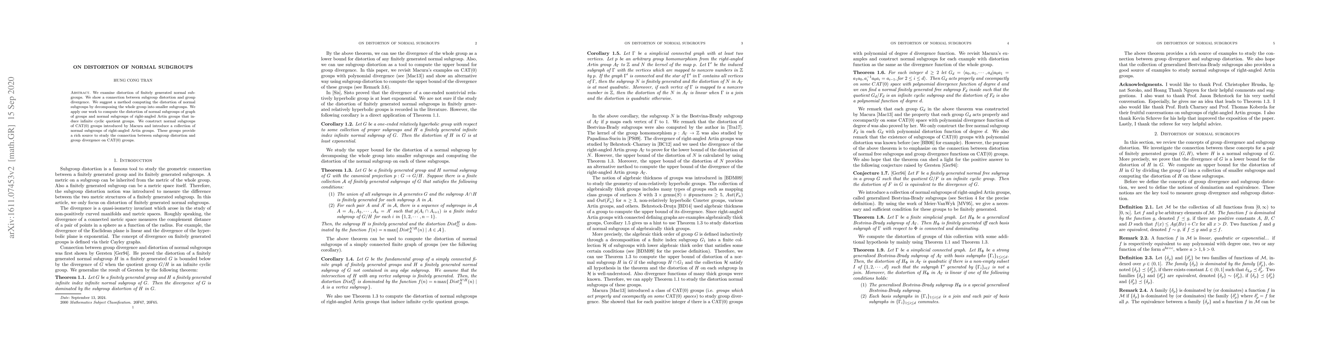 This paper investigates the distortion of finitely generated normal subgroups, establishing a link between subgroup distortion and group divergence. It proposes a method for computing distortion by decomposing groups into smaller subgroups, and applies this to compute distortions in graph of groups and right-angled Artin groups, providing insight into $\CAT(0)$ groups.