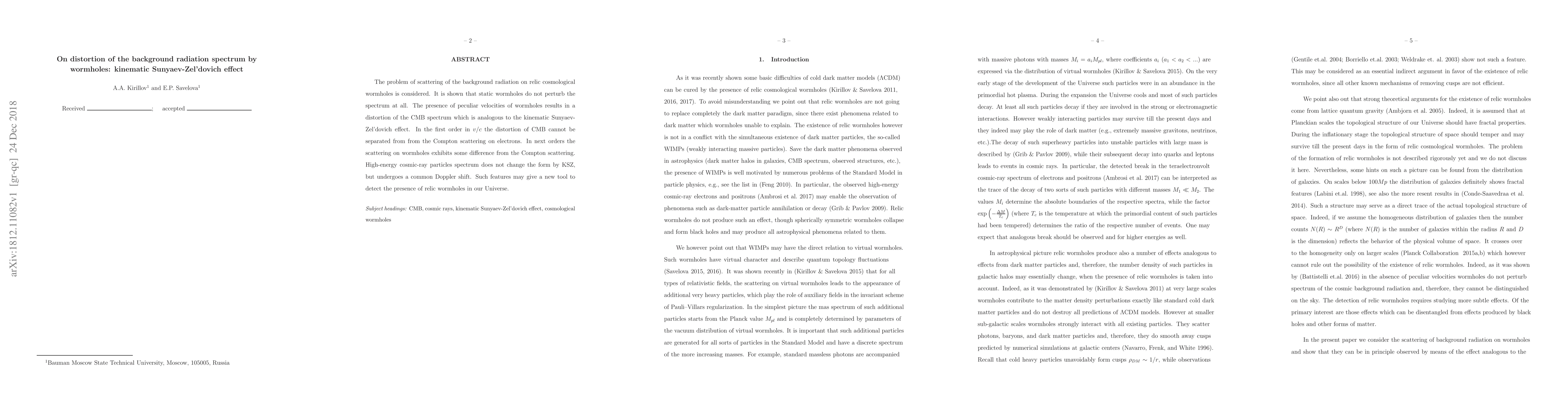 The problem of scattering of the background radiation on relic cosmological wormholes is considered. It is shown that static wormholes do not perturb the spectrum at all. The presence of peculiar velocities of wormholes results in a distortion of the CMB spectrum which is analogous to the kinematic Sunyaev-Zel'dovich effect. In the first order in $v/c$ the distortion of CMB cannot be separated from from the Compton scattering on electrons. In next orders the scattering on wormholes exhibits some difference from the Compton scattering. High-energy cosmic-ray particles spectrum does not change the form by KSZ, but undergoes a common Doppler shift. Such features may give a new tool to detect the presence of relic wormholes in our Universe.