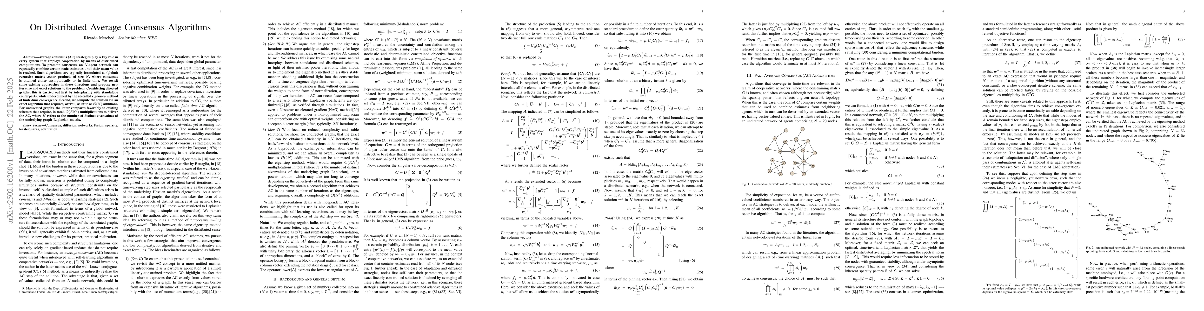 The paper revisits distributed average consensus (AC) algorithms, focusing on reducing computational complexity. It proposes new iterative and exact solutions, interplaying standalone counterparts for directed graphs, underpinned by the eigenstep method for finite-time convergence. For undirected graphs, it compares favorably to existing schemes requiring O(KN^2) multiplications.