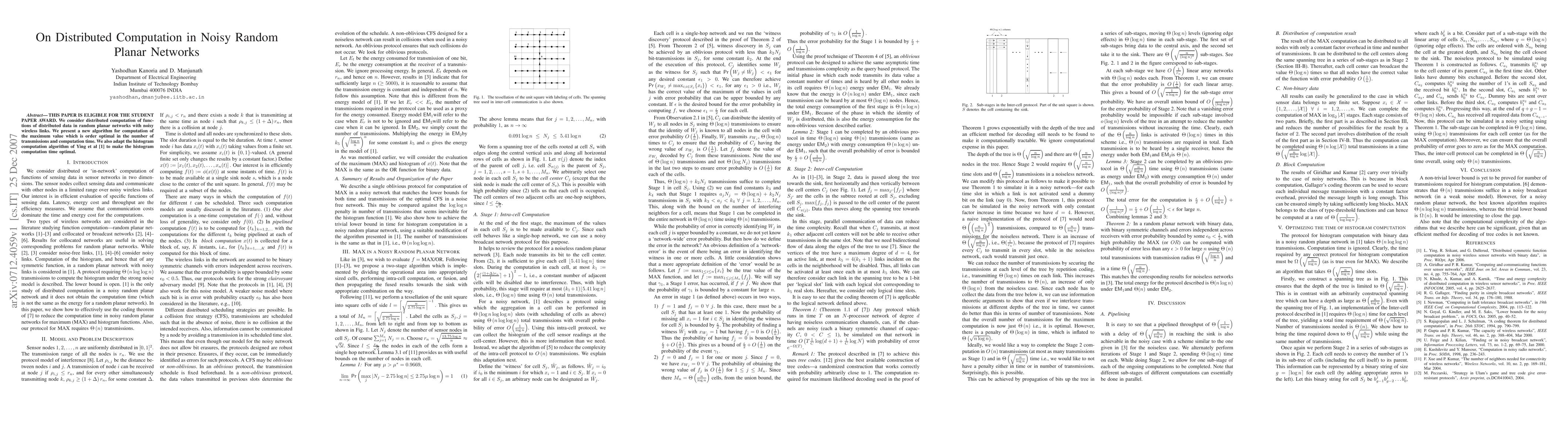 We consider distributed computation of functions of distributed data in random planar networks with noisy wireless links. We present a new algorithm for computation of the maximum value which is order optimal in the number of transmissions and computation time.We also adapt the histogram computation algorithm of Ying et al to make the histogram computation time optimal.
