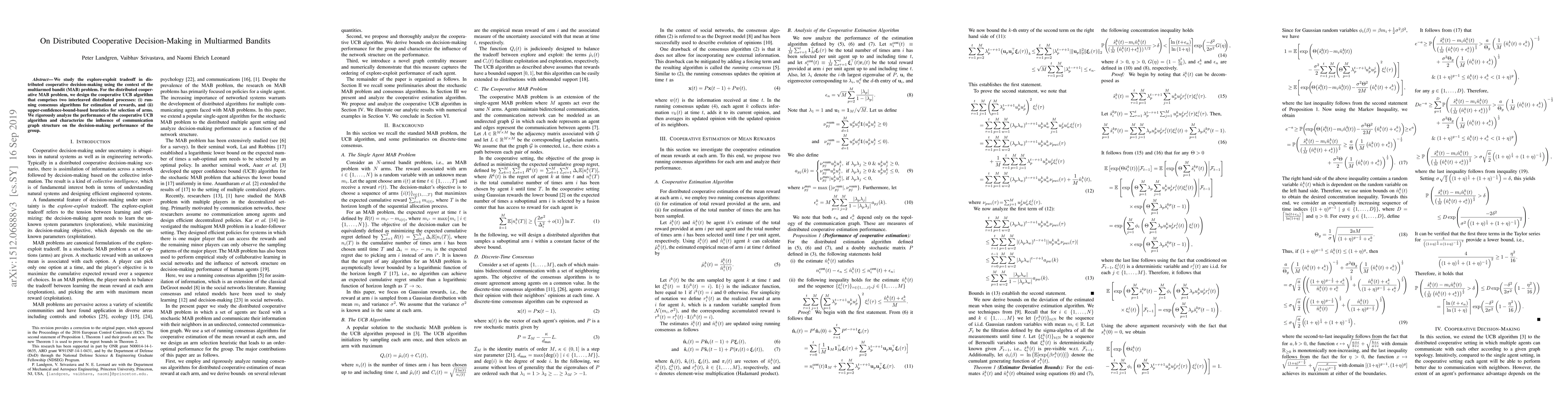 This paper introduces a cooperative UCB algorithm for distributed decision-making in multiarmed bandit problems, combining consensus algorithms for reward estimation and UCB-based heuristics for arm selection. The study analyzes the algorithm's performance and examines how the communication graph structure impacts group decision-making efficiency.