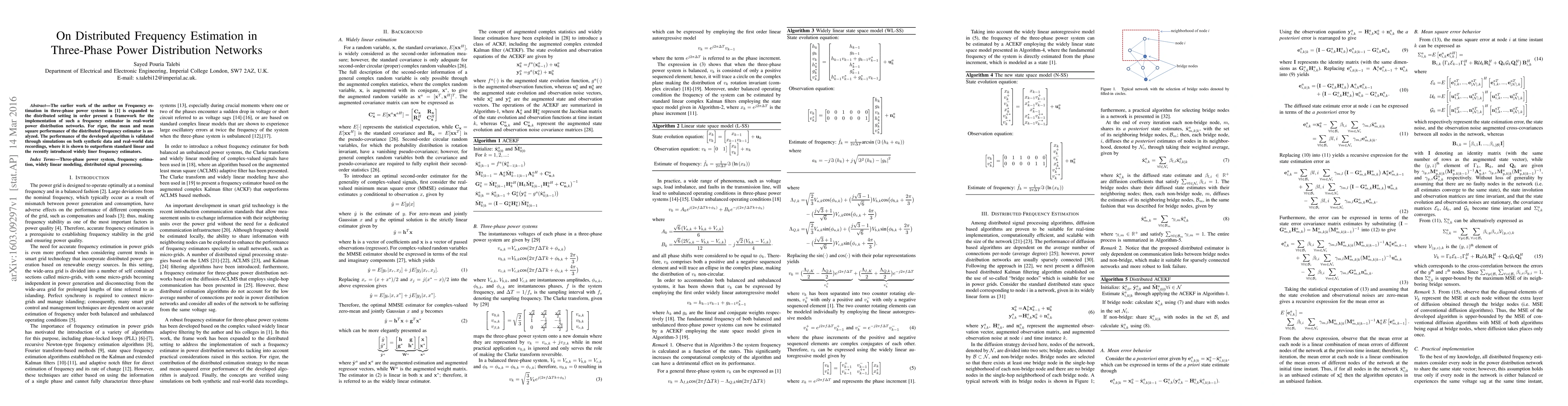 The earlier work of the author on Frequency estimation in three-phase power systems ( that is included as the reference number 1) is expanded to the distributed setting in order present a framework for the implementation of such a frequency estimator in real-world power distribution networks. For rigor, the mean and mean square performance of the distributed frequency estimator is analysed. The performance of the developed algorithm is validated through simulations on both synthetic data and real-world data recordings, where it is shown to outperform standard linear and the recently introduced widely liner frequency estimators.