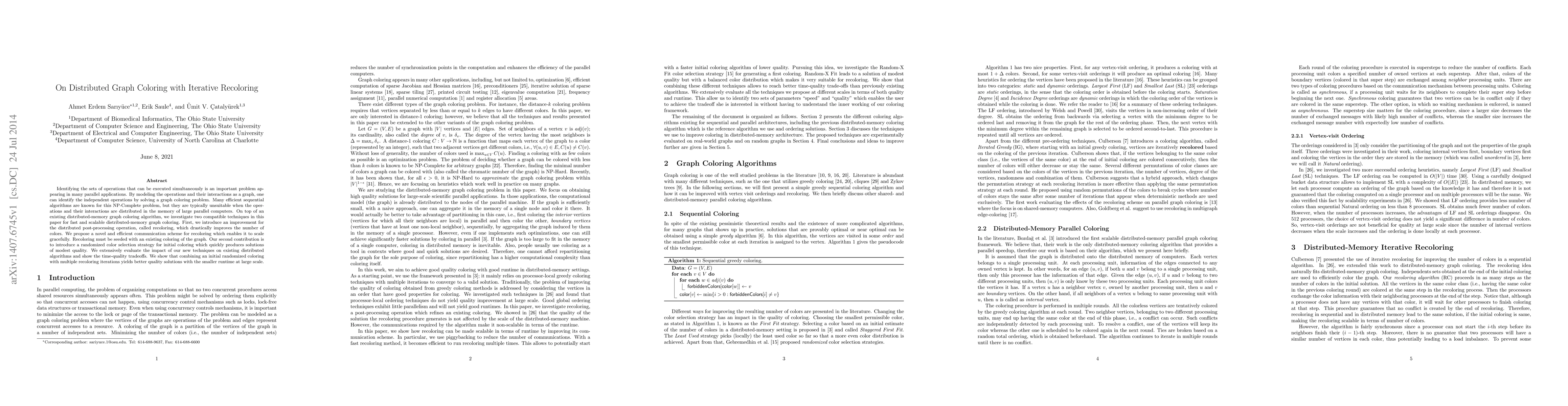 This paper investigates scalable distributed-memory graph coloring techniques, focusing on iterative recoloring and randomized initial coloring strategies. The authors propose an efficient communication scheme for recoloring and a randomized color selection method, demonstrating improved quality and reduced runtime for large-scale parallel applications.