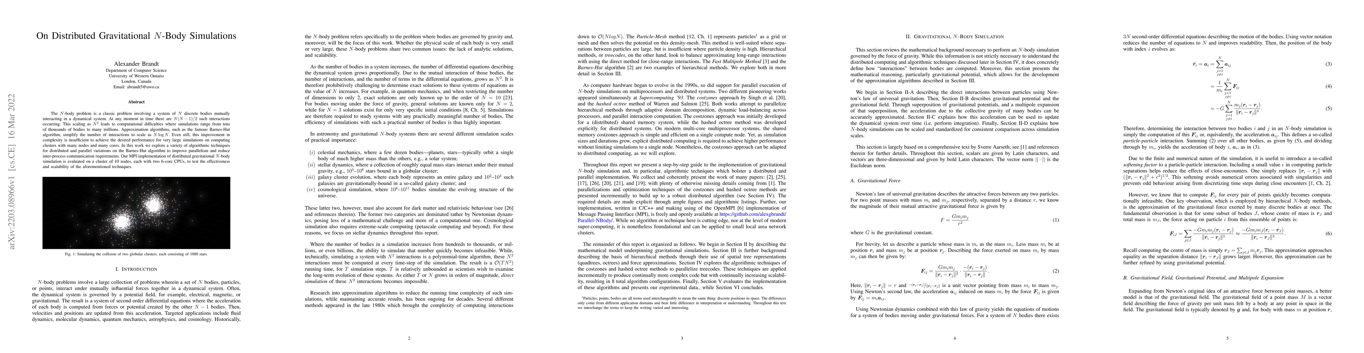 This paper explores distributed and parallel algorithmic techniques to enhance the performance of gravitational N-body simulations, focusing on the Barnes-Hut algorithm. An MPI-based implementation is evaluated on a 10-node cluster to assess scalability and effectiveness.