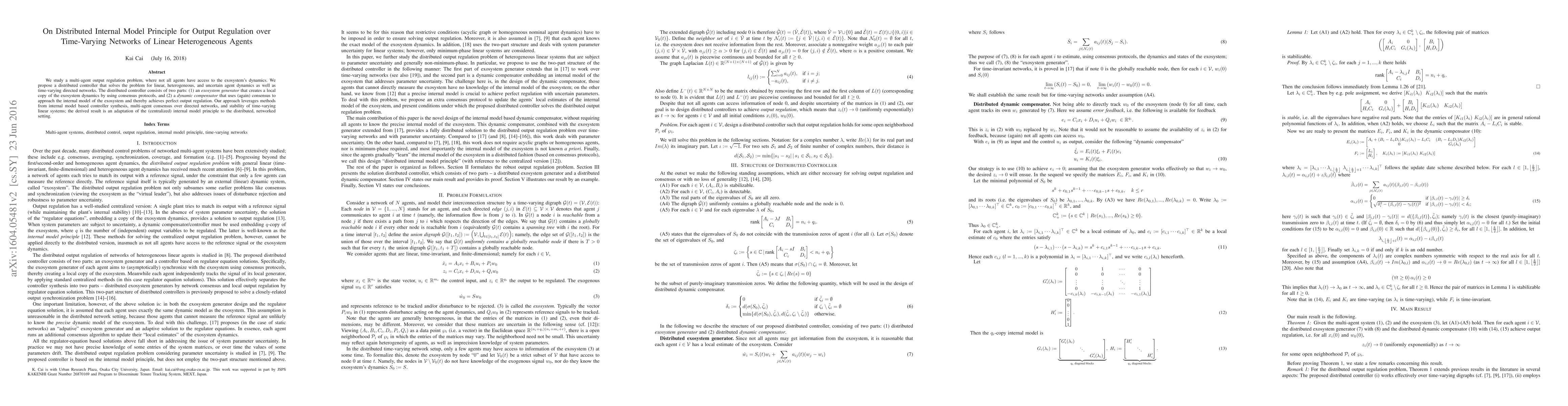We study a multi-agent output regulation problem, where not all agents have access to the exosystem's dynamics. We propose a distributed controller that solves the problem for linear, heterogeneous, and uncertain agent dynamics as well as time-varying directed networks. The distributed controller consists of two parts: (1) an exosystem generator that creates a local copy of the exosystem dynamics by using consensus protocols, and (2) a dynamic compensator that uses (again) consensus to approach the internal model of the exosystem and thereby achieves perfect output regulation. Our approach leverages methods from internal model based controller synthesis, multi-agent consensus over directed networks, and stability of time-varying linear systems; the derived result is an adaptation of the (centralized) internal model principle to the distributed, networked setting.