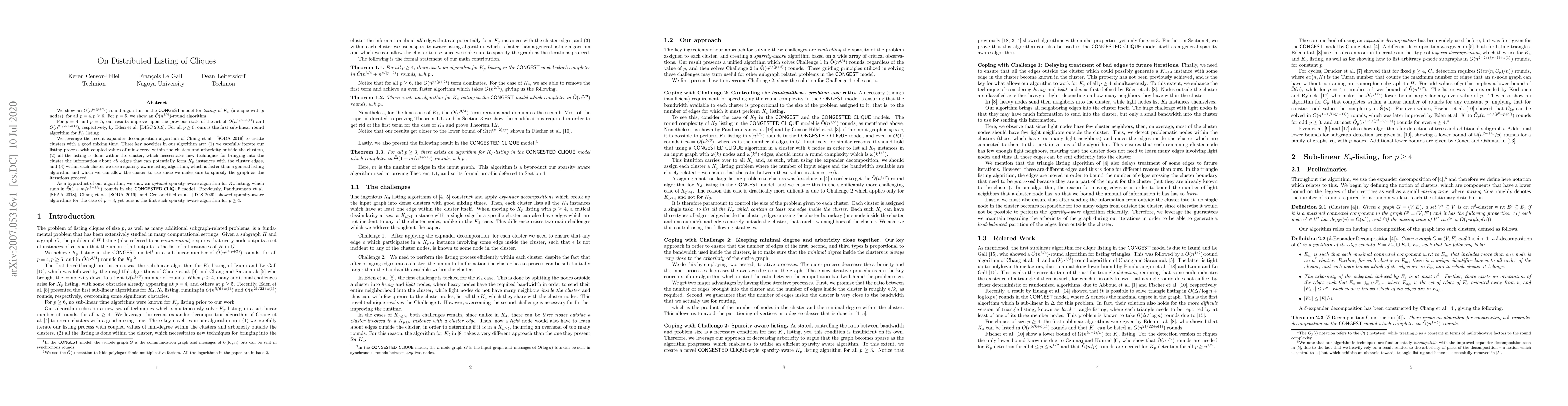 We show an $\tilde{O}(n^{p/(p+2)})$-round algorithm in the \congest model for \emph{listing} of $K_p$ (a clique with $p$ nodes), for all $p =4, p\geq 6$. For $p = 5$, we show an $\tilde{O}(n^{3/4})$-round algorithm. For $p=4$ and $p=5$, our results improve upon the previous state-of-the-art of $O(n^{5/6+o(1)})$ and $O(n^{21/22+o(1)})$, respectively, by Eden et al. [DISC 2019]. For all $p\geq 6$, ours is the first sub-linear round algorithm for $K_p$ listing. We leverage the recent expander decomposition algorithm of Chang et al. [SODA 2019] to create clusters with a good mixing time. Three key novelties in our algorithm are: (1) we carefully iterate our listing process with coupled values of min-degree within the clusters and arboricity outside the clusters, (2) all the listing is done within the cluster, which necessitates new techniques for bringing into the cluster the information about \emph{all} edges that can potentially form $K_p$ instances with the cluster edges, and (3) within each cluster we use a sparsity-aware listing algorithm, which is faster than a general listing algorithm and which we can allow the cluster to use since we make sure to sparsify the graph as the iterations proceed. As a byproduct of our algorithm, we show an \emph{optimal} sparsity-aware algorithm for $K_p$ listing, which runs in $\tilde{\Theta}(1 + m/n^{1 + 2/p})$ rounds in the \clique model. Previously, Pandurangan et al. [SPAA 2018], Chang et al. [SODA 2019], and Censor-Hillel et al. [TCS 2020] showed sparsity-aware algorithms for the case of $p = 3$, yet ours is the first such sparsity aware algorithm for $p \geq 4$.