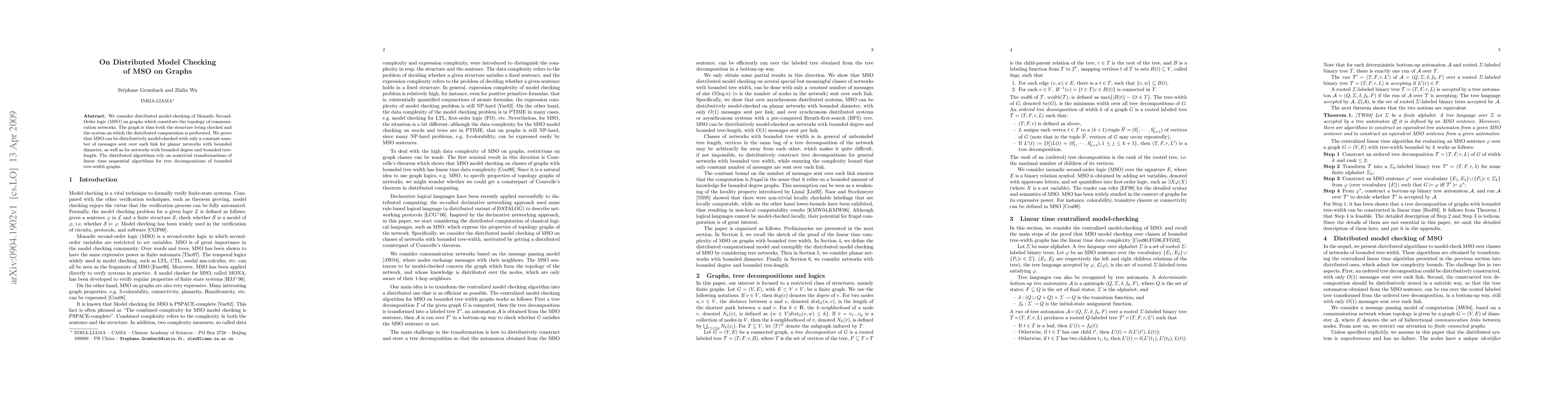 This paper explores the distributed model-checking of Monadic Second-Order logic (MSO) on graph structures, which represent communication networks. It demonstrates that MSO can be efficiently checked in planar networks with bounded diameter, as well as in networks of bounded degree and tree-length, using a constant number of messages per link.