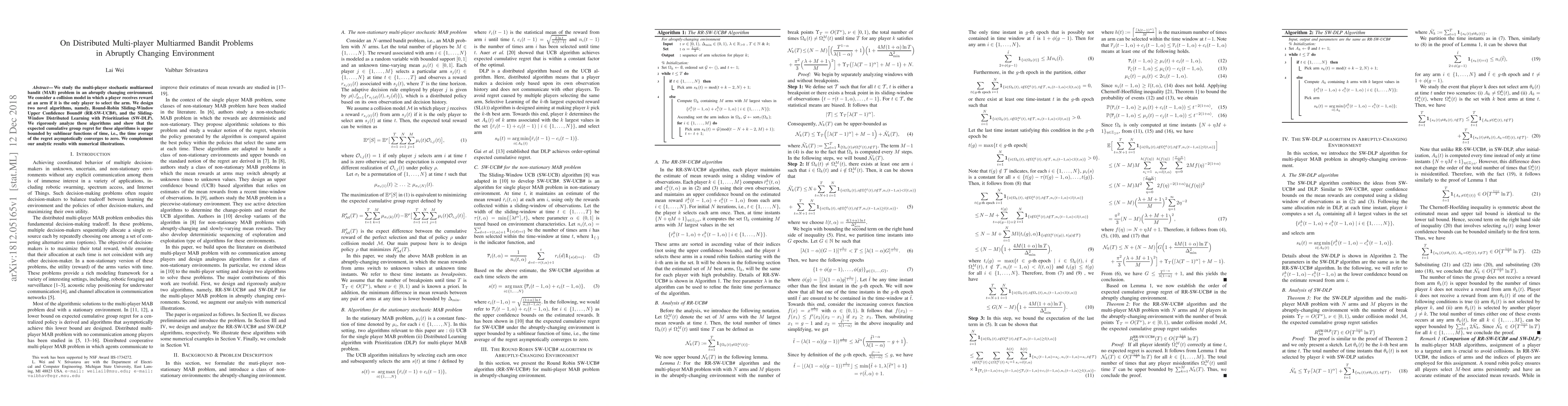 This paper investigates multi-player stochastic multiarmed bandit problems in environments that change abruptly. It proposes two algorithms, RR-SW-UCB# and SW-DLP, which achieve sublinear regret bounds and demonstrate convergence to zero regret over time, supported by both theoretical analysis and numerical results.