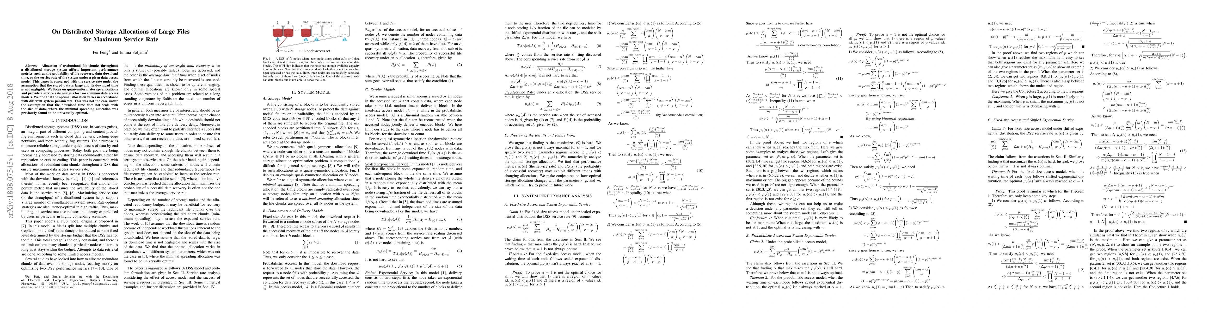 This paper investigates optimal quasi-uniform storage allocations for large files in distributed systems to maximize service rates, analyzing two common data access models and finding that the best allocation strategy varies with system parameters, unlike previous findings where minimal spreading was universally optimal.