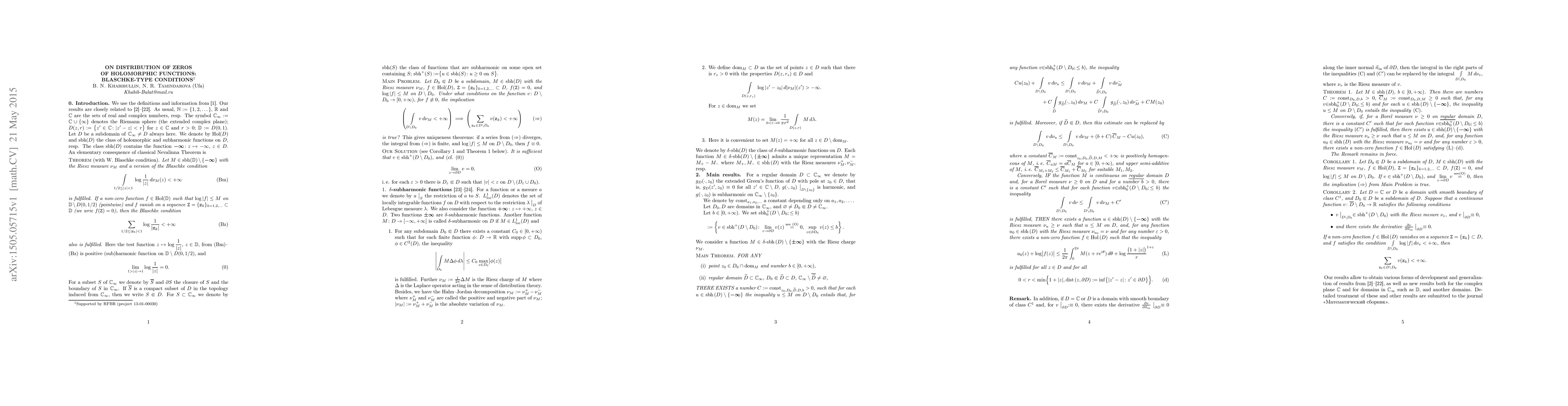 Summary: This paper introduces a series of Blaschke-type conditions for subsequences of zeros of holomorphic functions in arbitrary domains of the extended complex plane, providing a new framework for the distribution of zeros.