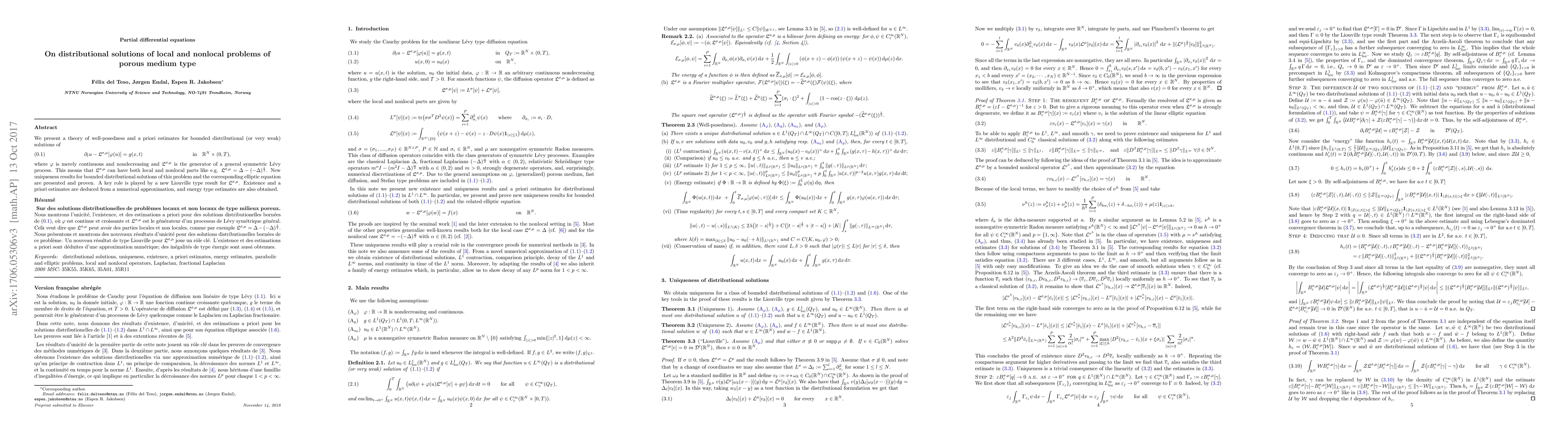 We present a theory of well-posedness and a priori estimates for bounded distributional (or very weak) solutions of $$\partial_tu-\mathfrak{L}^{\sigma,\mu}[\varphi(u)]=g(x,t)\quad\quad\text{in}\quad\quad \mathbb{R}^N\times(0,T),$$ where $\varphi$ is merely continuous and nondecreasing and $\mathfrak{L}^{\sigma,\mu}$ is the generator of a general symmetric L\'evy process. This means that $\mathfrak{L}^{\sigma,\mu}$ can have both local and nonlocal parts like e.g. $\mathfrak{L}^{\sigma,\mu}=\Delta-(-\Delta)^{\frac12}$. New uniqueness results for bounded distributional solutions of this problem and the corresponding elliptic equation are presented and proven. A key role is played by a new Liouville type result for $\mathfrak{L}^{\sigma,\mu}$. Existence and a priori estimates are deduced from a numerical approximation, and energy type estimates are also obtained.