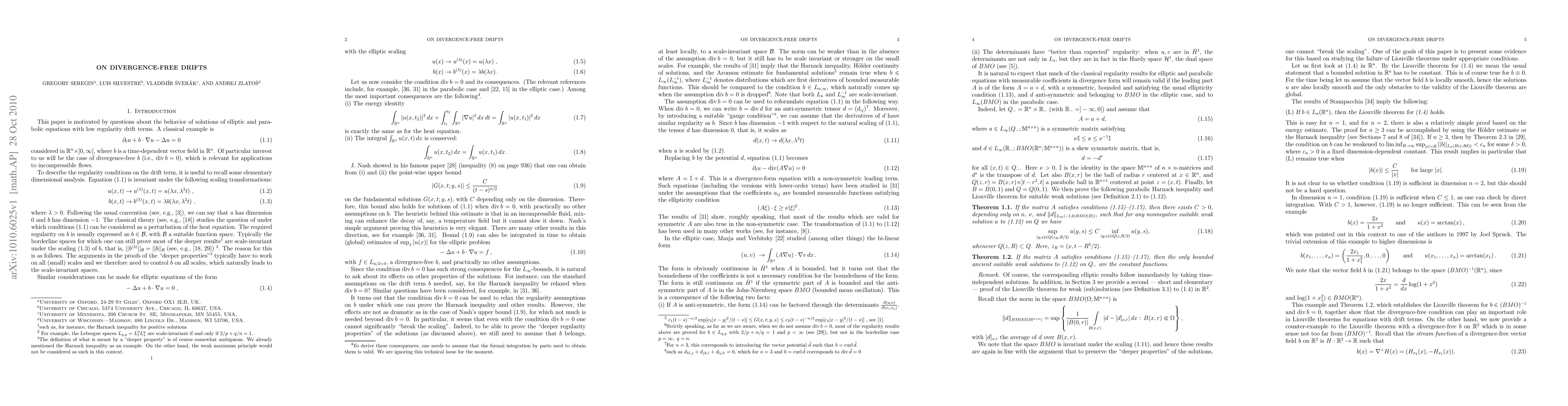 We investigate the validity and failure of Liouville theorems and Harnack inequalities for parabolic and elliptic operators with low regularity coefficients. We are particularly interested in operators of the form $\partial_t - \Delta +b\cdot\nabla$ and $-\Delta +b\cdot\nabla$ with a divergence-free drift $b$. We prove the Liouville theorem and Harnack inequality when $b\in L_\infty(BMO^{-1})$ resp. $b\in BMO^{-1}$ and provide a counterexample to such results demonstrating sharpness of our conditions on the drift. Our results generalize to divergence-form operators with an elliptic symmetric part and a BMO skew-symmetric part. We also prove the existence of a modulus of continuity for solutions to the elliptic problem in two dimensions, depending on the non-scale-invariant norm $\|b\|_{L_1}$. In three dimensions, on the other hand, bounded solutions with $L_1$ drifts may be discontinuous.
