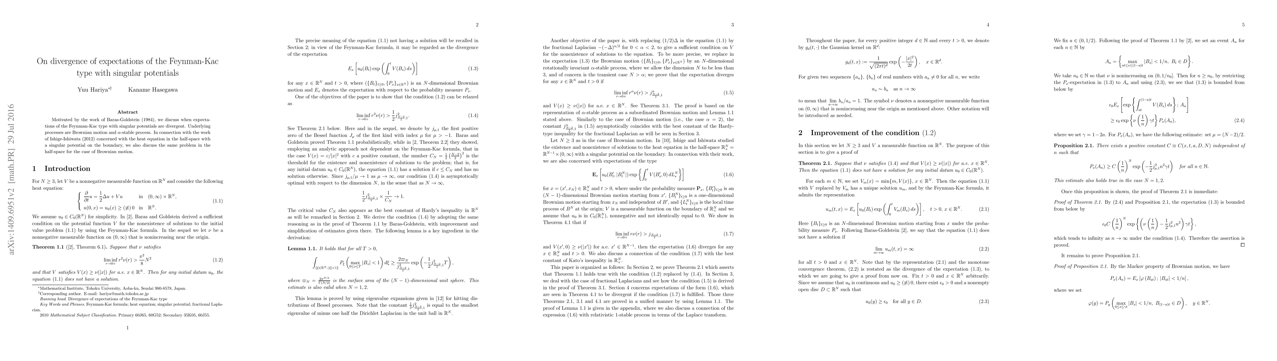 This paper investigates the divergence of Feynman-Kac type expectations involving singular potentials, focusing on Brownian motion and $\alpha$-stable processes. It extends prior work by Ishige-Ishiwata (2012) to examine similar divergence issues in the context of the heat equation in half-spaces.
