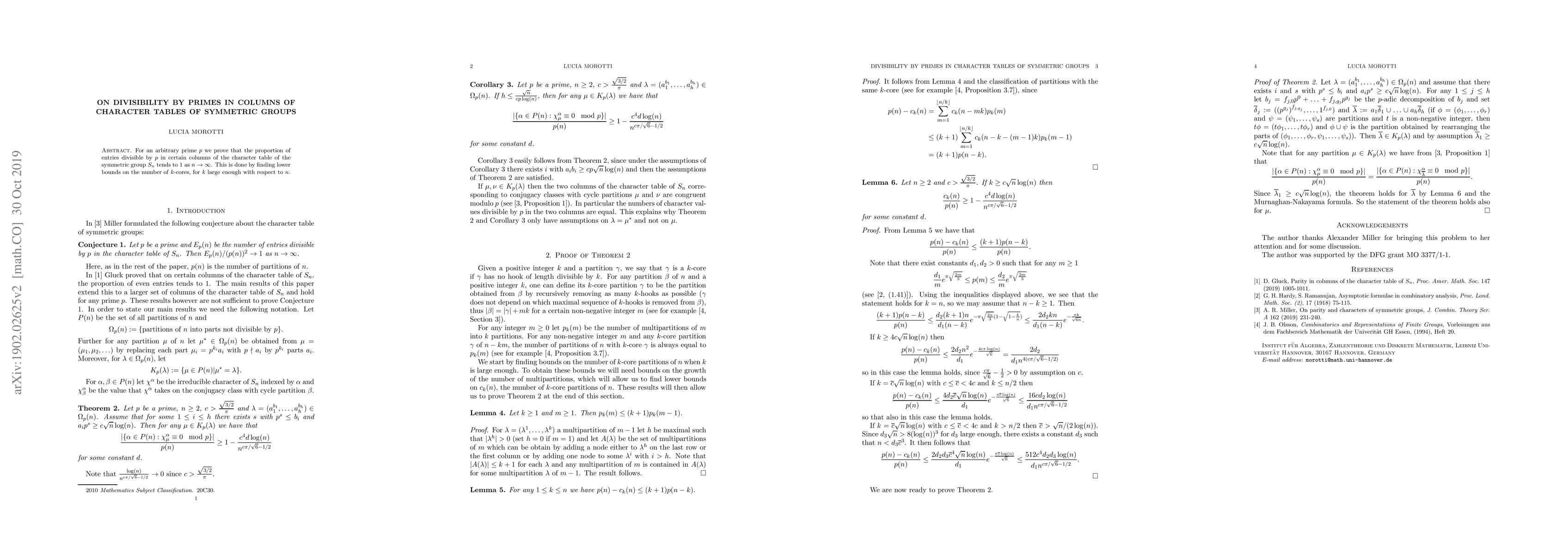 Summary: The paper proves that the proportion of entries divisible by an arbitrary prime $p$ in specific columns of the character table of the symmetric group $S_n$ approaches 1 as $n$ tends to infinity, achieved by establishing lower bounds for the number of $k$-cores for sufficiently large $k$ relative to $n$.