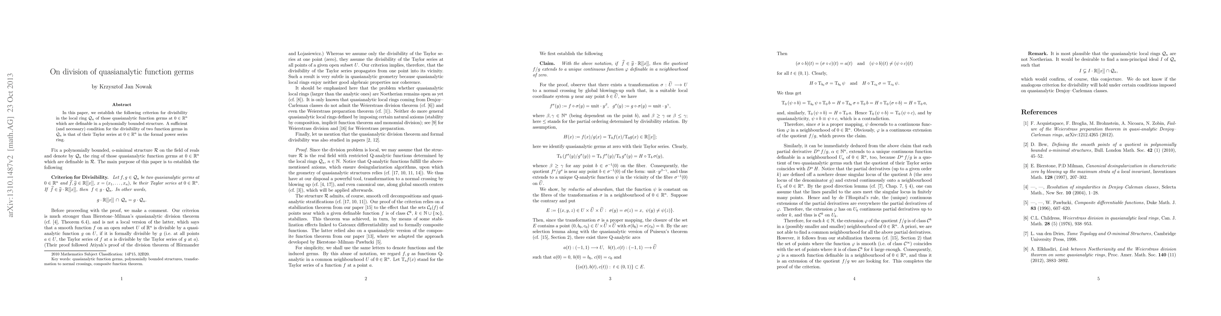 This paper provides a criterion for the divisibility of quasianalytic function germs in a polynomially bounded structure, showing that two such germs are divisible if and only if their Taylor series at zero are divisible in the formal power series ring.