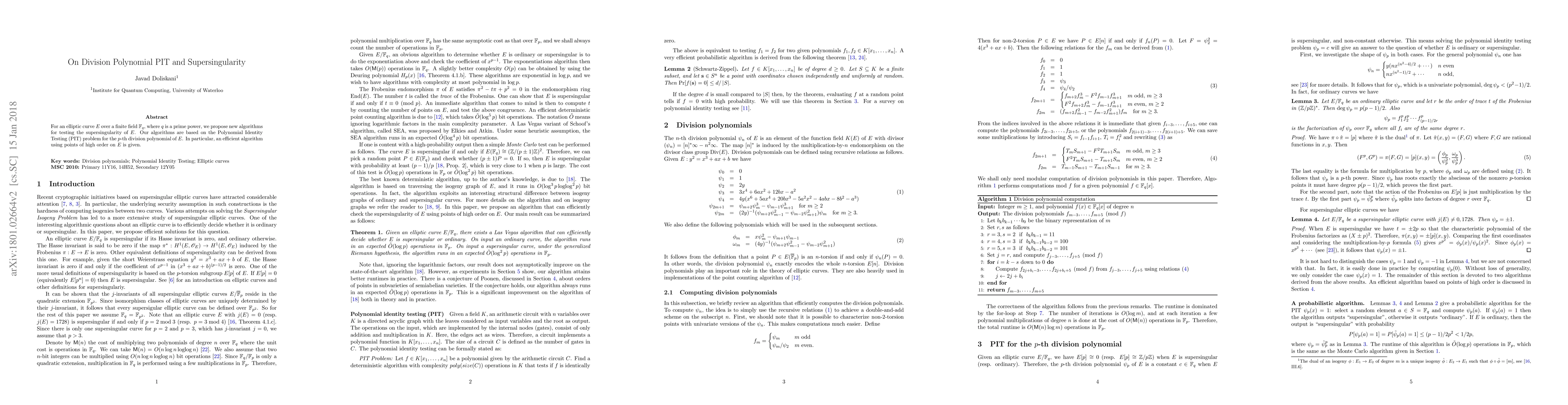For an elliptic curve $E$ over a finite field $\F_q$, where $q$ is a prime power, we propose new algorithms for testing the supersingularity of $E$. Our algorithms are based on the Polynomial Identity Testing (PIT) problem for the $p$-th division polynomial of $E$. In particular, an efficient algorithm using points of high order on $E$ is given.