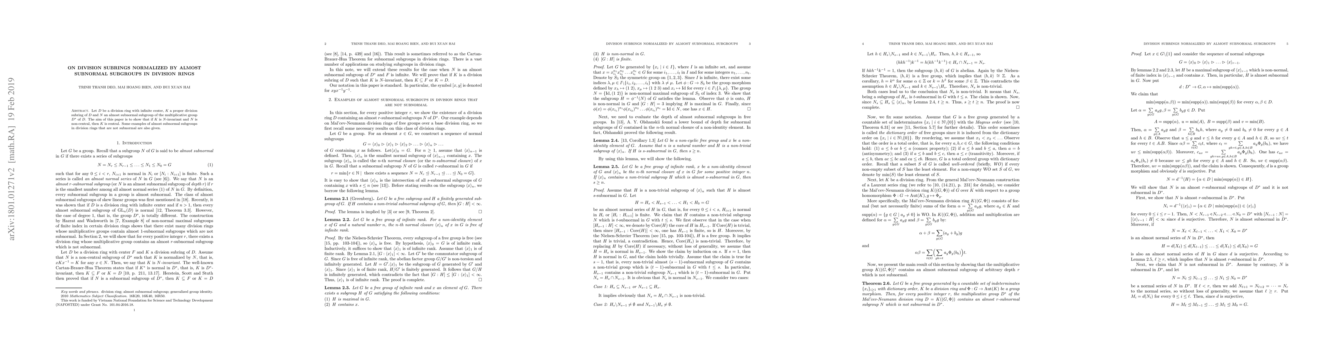 This paper investigates division subrings $K$ in division rings $D$ normalized by almost subnormal subgroups $N$, proving that if $K$ is $N$-invariant and $N$ is non-central, then $K$ must be central. It also provides examples of almost subnormal subgroups that do not meet the criteria of subnormality.