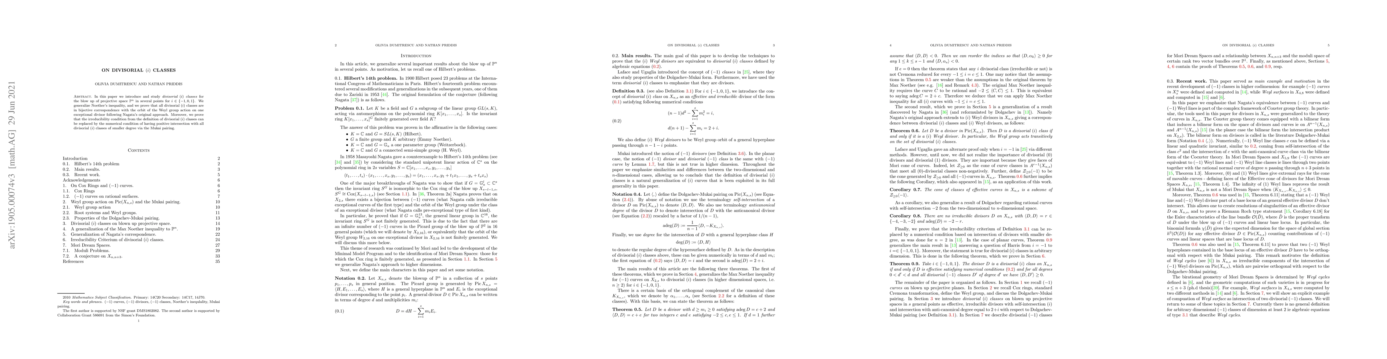 In this paper we introduce and study divisorial (i) classes} for the blow up of projective space in several points for i=-1,0 and 1. We generalize Noether's inequality, and we prove that all divisorial (i) classes are in bijective correspondence with the orbit of the Weyl group action on one exceptional divisor following Nagata's original approach. Moreover, we prove that the irreducibility condition from the definition of divisorial (i) classes can be replaced by the numerical condition of having positive intersection with all divisorial (i) classes of smaller degree via the Mukai pairing.