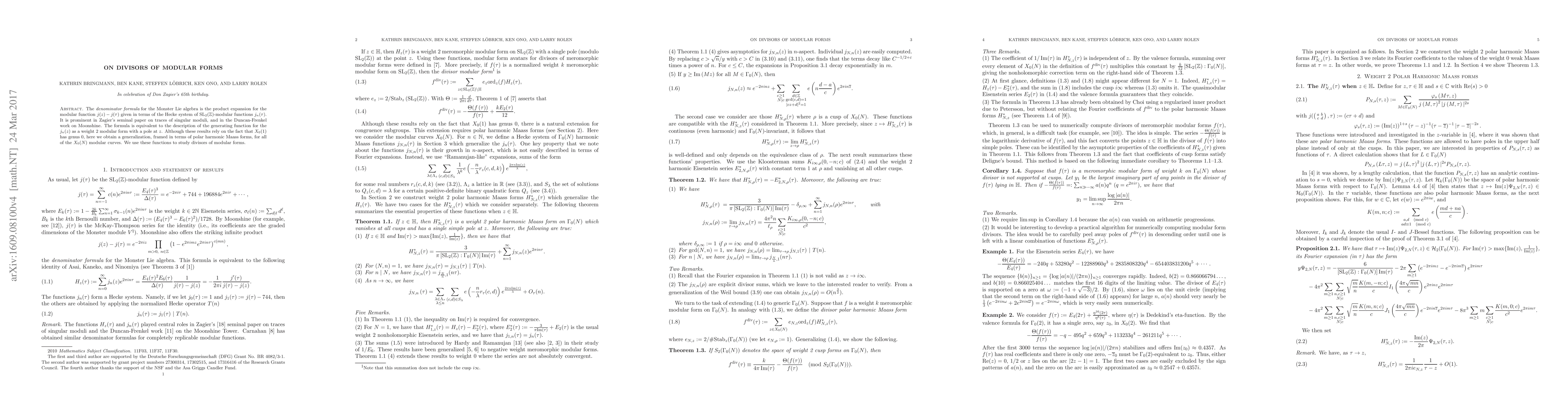 The denominator formula for the Monster Lie algebra is the product expansion for the modular function $j(z)-j(\tau)$ given in terms of the Hecke system of $\operatorname{SL}_2(\mathbb Z)$-modular functions $j_n(\tau)$. It is prominent in Zagier's seminal paper on traces of singular moduli, and in the Duncan-Frenkel work on Moonshine. The formula is equivalent to the description of the generating function for the $j_n(z)$ as a weight 2 modular form with a pole at $z$. Although these results rely on the fact that $X_0(1)$ has genus 0, here we obtain a generalization, framed in terms of polar harmonic Maass forms, for all of the $X_0(N)$ modular curves. We use these functions to study divisors of modular forms.