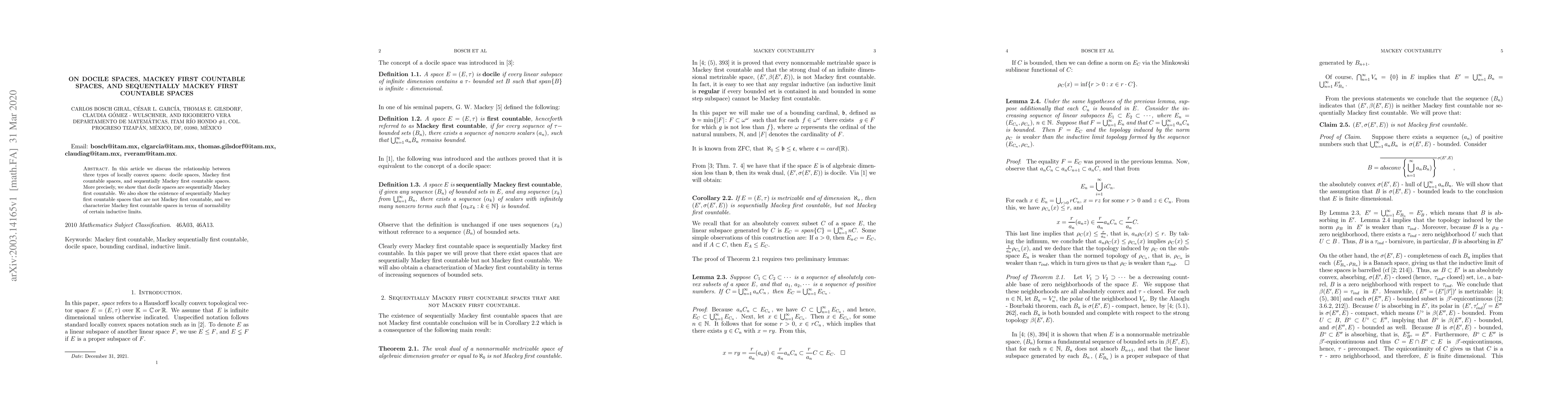 In this article we discuss the relationship between three types of locally convex spaces: docile spaces, Mackey first countable spaces, and sequentially Mackey first countable spaces. More precisely, we show that docile spaces are sequentially Mackey first countable. We also show the existence of sequentially Mackey first countable spaces that are not Mackey first countable, and we characterize Mackey first countable spaces in terms of normability of certain inductive limits.