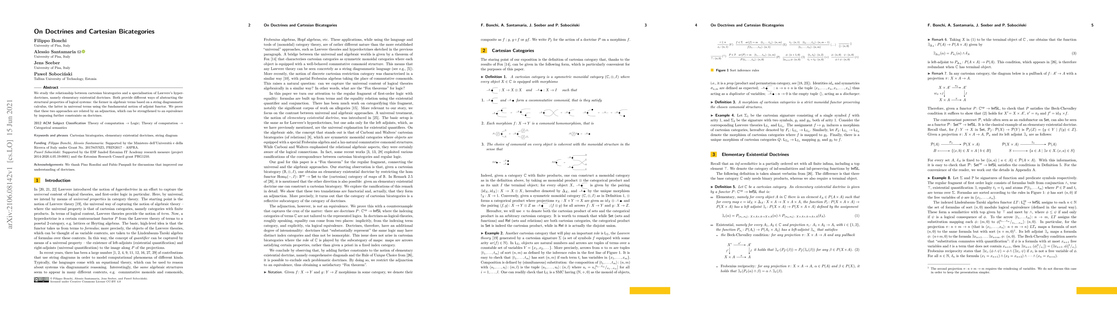 This paper explores the connection between cartesian bicategories and elementary existential doctrines, showing that these two abstract approaches to logical structures are related via an adjunction, which can be enhanced to an equivalence under certain constraints.