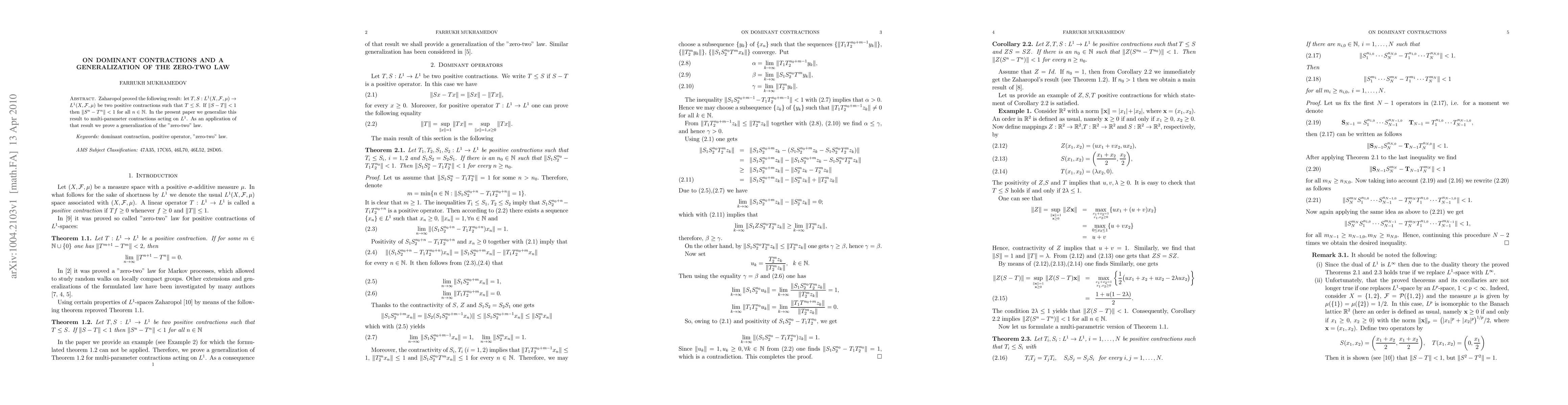 This paper generalizes Zaharopol's result on dominant contractions in $L^1$ spaces to multi-parameter contractions, showing that if $\|S-T\|<1$ for positive contractions $T$ and $S$, then $\|S^n-T^n\|<1$ for all $n$. An application of this generalization proves a broader version of the zero-two law.