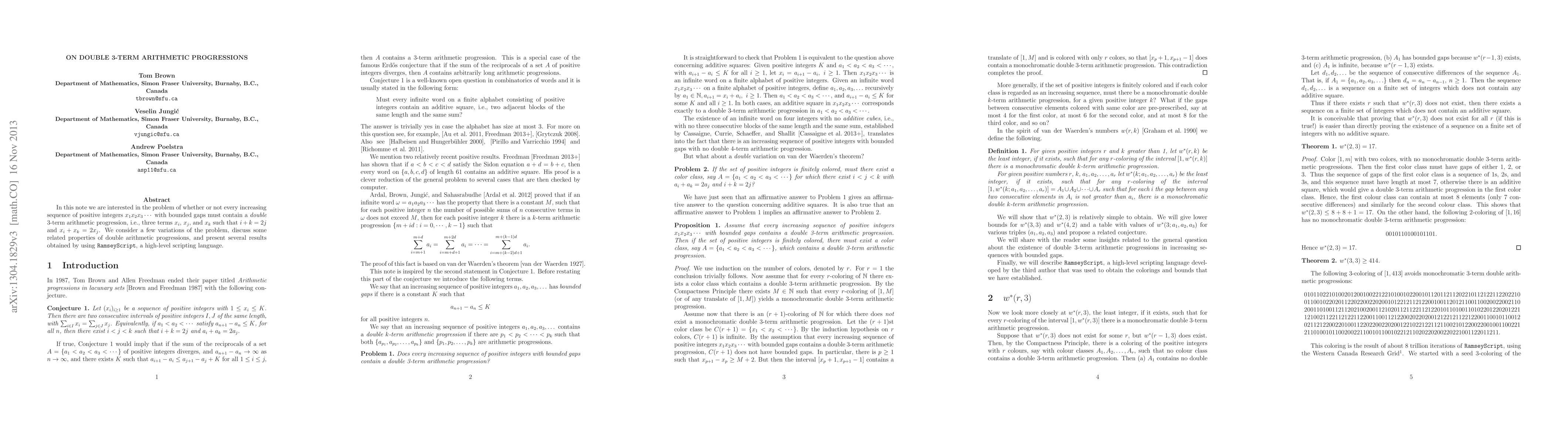 In this note we are interested in the problem of whether or not every increasing sequence of positive integers $x_1x_2x_3...$ with bounded gaps must contain a double 3-term arithmetic progression, i.e., three terms $x_i$, $x_j$, and $x_k$ such that $i + k = 2j$ and $x_i + x_k = 2x_j$. We consider a few variations of the problem, discuss some related properties of double arithmetic progressions, and present several results obtained by using RamseyScript, a high-level scripting language.