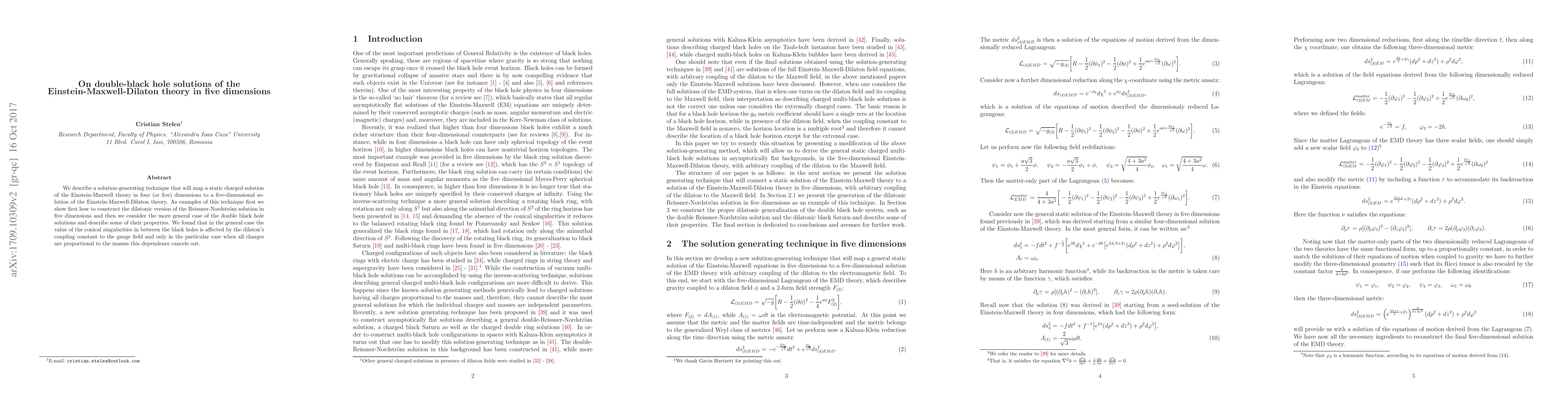 The paper presents a method to transform charged solutions from four to five dimensions in Einstein-Maxwell theory, using Einstein-Maxwell-Dilaton theory. It demonstrates this with the Reissner-Nordström solution and double black hole solutions, revealing that conical singularities' values depend on the dilaton's coupling constant to the gauge field, except when charges proportionally match masses.