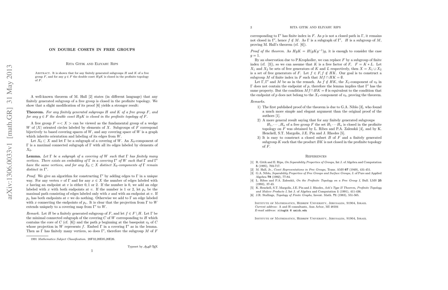 This research proves that in any free group F, double cosets HgK, formed by any finitely generated subgroups H and K and any group element g, are closed under the profinite topology of F.