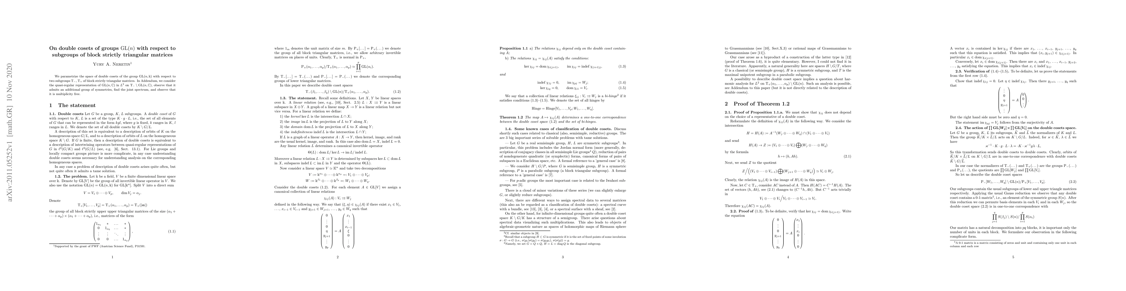 This paper parametrizes the double cosets of $GL(n,\Bbbk)$ with respect to subgroups $T_-$ and $T_+$ of block strictly triangular matrices. It also examines the quasi-regular representation of $GL(n,\Bbb{C})$ in $L^2$ on $T_- \ GL(n,\Bbb{C})$, revealing an additional symmetry group and a multiplicity-free joint spectrum.