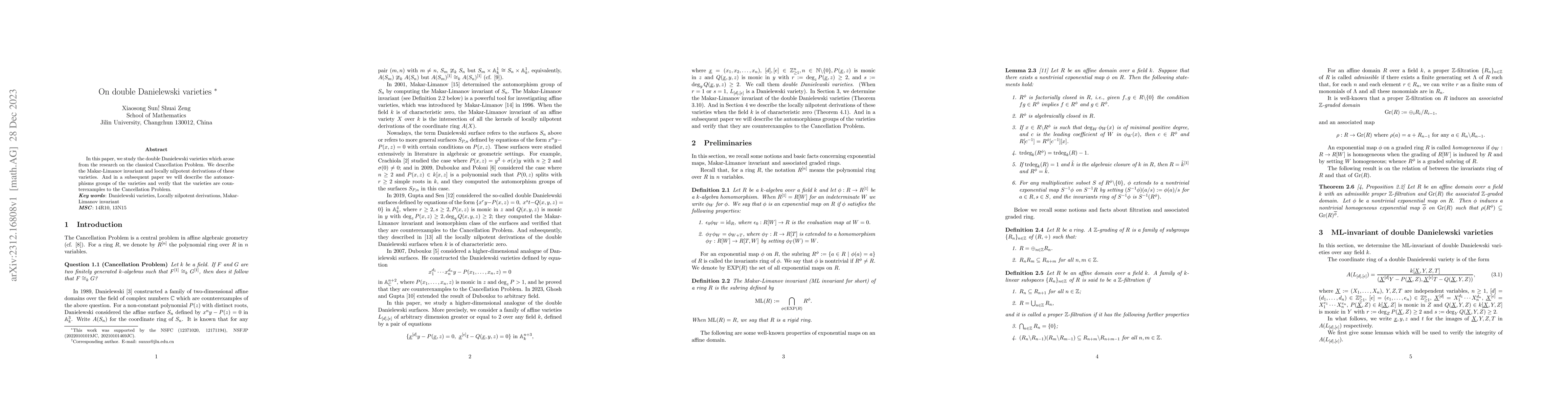 This paper investigates double Danielewski varieties originating from the Cancellation Problem, focusing on their Makar-Limanov invariant and locally nilpotent derivations, while a follow-up will explore their automorphism groups and confirm their role as counterexamples to the Cancellation Problem.