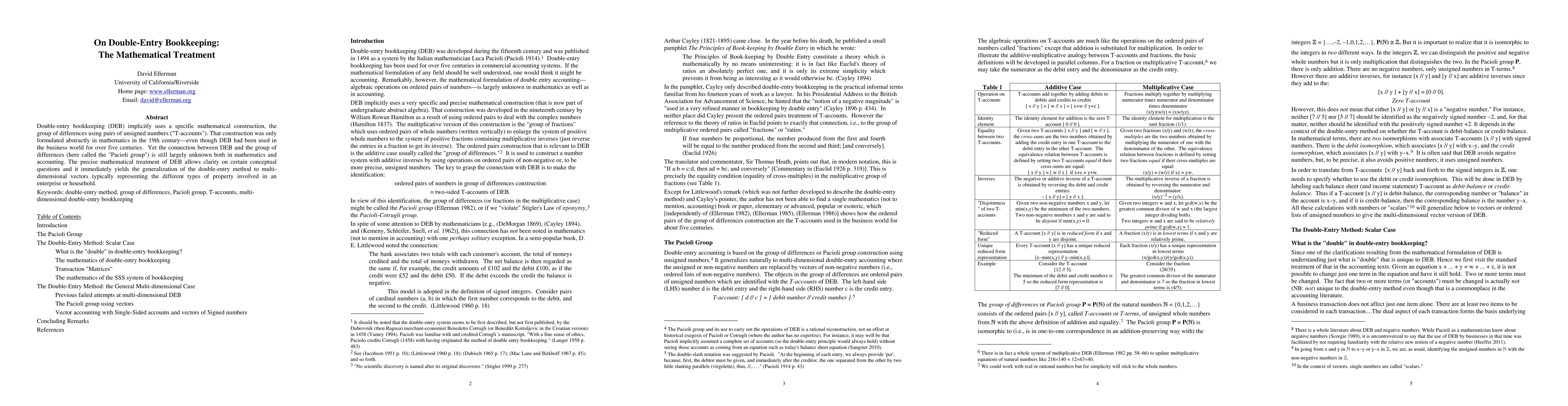 Double-entry bookkeeping (DEB) implicitly uses a specific mathematical construction, the group of differences using pairs of unsigned numbers ("T-accounts"). That construction was only formulated abstractly in mathematics in the 19th century--even though DEB had been used in the business world for over five centuries. Yet the connection between DEB and the group of differences (here called the "Pacioli group") is still largely unknown both in mathematics and accounting. The precise mathematical treatment of DEB allows clarity on certain conceptual questions and it immediately yields the generalization of the double-entry method to multi-dimensional vectors typically representing the different types of property involved in an enterprise or household.