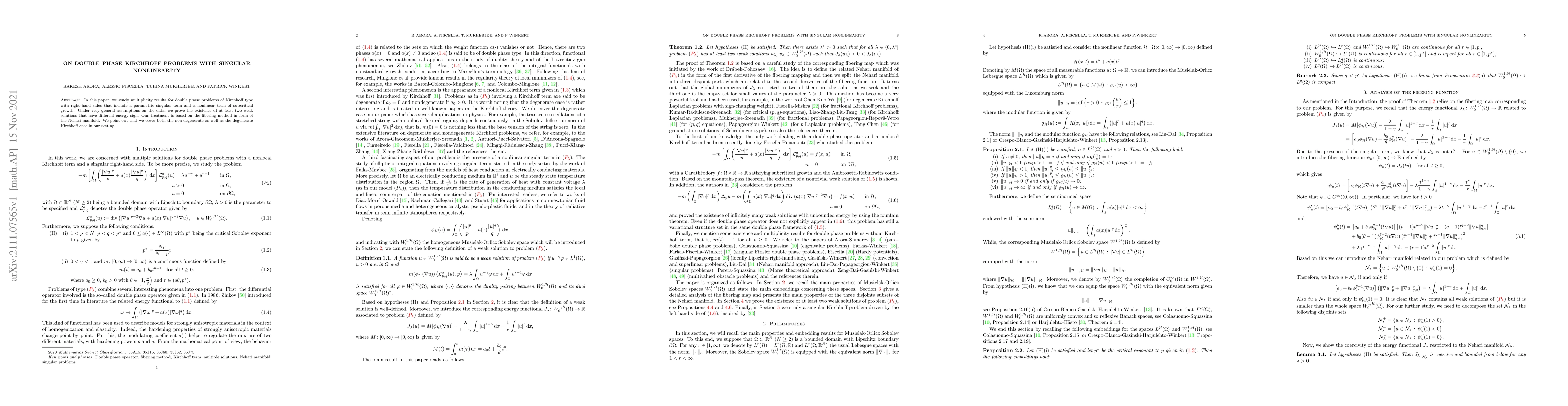 This paper investigates double phase Kirchhoff problems featuring singular nonlinearities and subcritical growth terms. It establishes the existence of at least two distinct weak solutions using the fibering method via the Nehari manifold, covering both non-degenerate and degenerate cases.