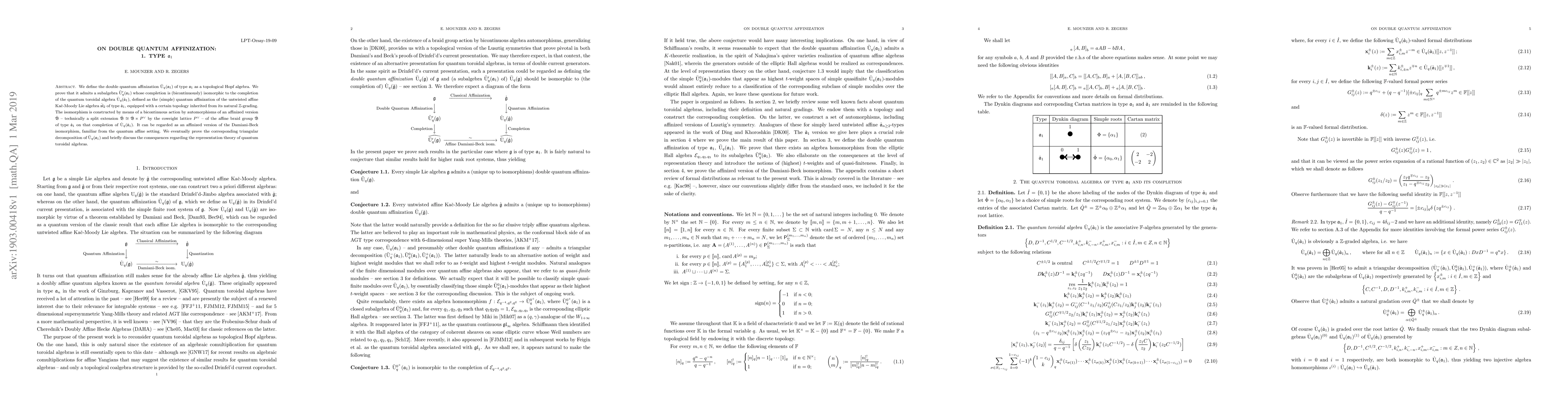 We define the double quantum affinization $\ddot{\mathrm{U}}_q(\mathfrak a_1)$ of type $\mathfrak{a}_1$ as a topological Hopf algebra. We prove that it admits a subalgebra $\ddot{\mathrm{U}}_q'(\mathfrak a_1)$ whose completion is (bicontinuously) isomorphic to the completion of the quantum toroidal algebra $\dot{\mathrm{U}}_q(\dot{\mathfrak a}_1)$, defined as the (simple) quantum affinization of the untwisted affine Kac-Moody Lie algebra $\dot{\mathfrak{sl}}_2$ of type $\dot{\mathfrak a}_1$, equipped with a certain topology inherited from its natural $\mathbb Z$-grading. The isomorphism is constructed by means of a bicontinuous action by automorphisms of an affinized version $\ddot{\mathfrak B}$ -- technically a split extension $\ddot{\mathfrak B} \cong \dot{\mathfrak B} \ltimes P^\vee$ by the coweight lattice $P^\vee$ -- of the affine braid group $\dot{\mathfrak B}$ of type $\dot{\mathfrak a}_1$ on that completion of $\dot{\mathrm{U}}_q(\dot{\mathfrak a}_1)$. It can be regarded as an affinized version of the Damiani-Beck isomorphism, familiar from the quantum affine setting. We eventually prove the corresponding triangular decomposition of $\ddot{\mathrm{U}}_q(\mathfrak a_1)$ and briefly discuss the consequences regarding the representation theory of quantum toroidal algebras.
