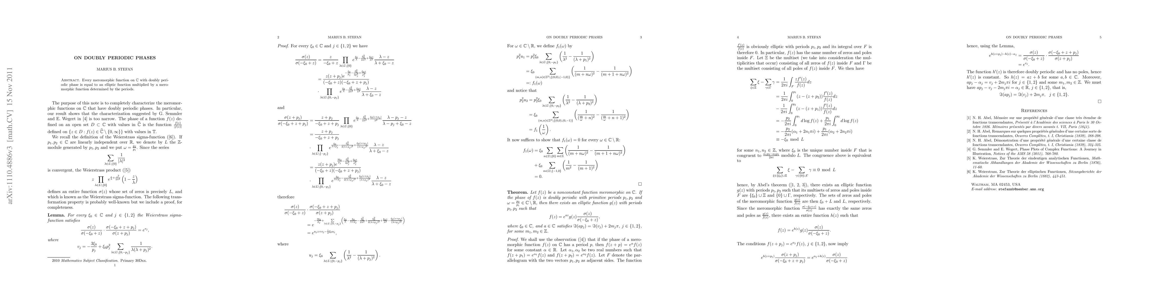Every meromorphic function on $\mathbb{C}$ with doubly periodic phase is equal to an elliptic function multiplied by a meromorphic function determined by the periods.
