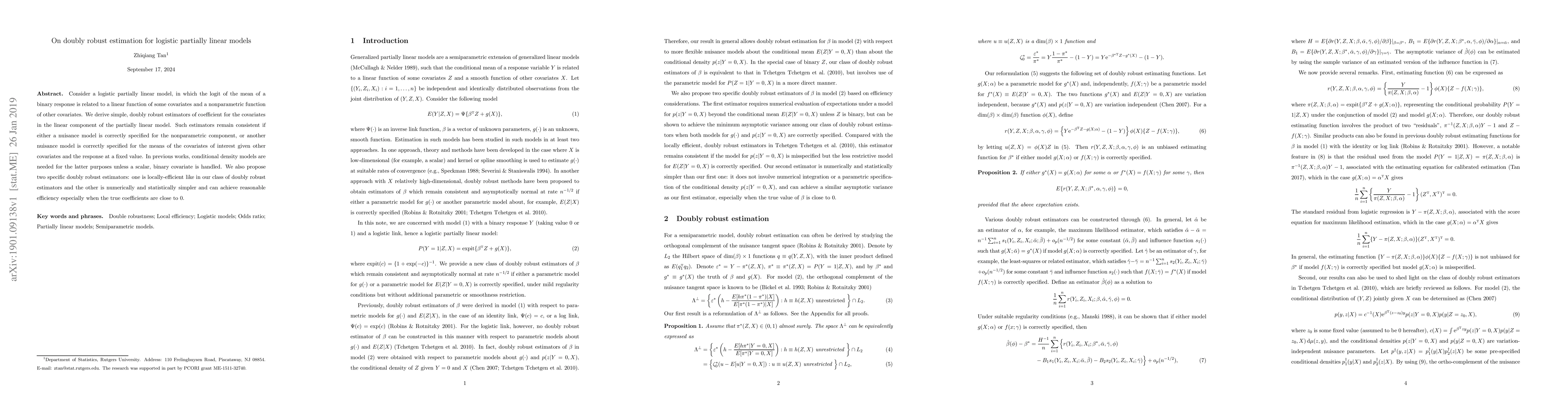 This paper develops doubly robust estimators for logistic partially linear models, ensuring consistency even if one of the nuisance models is correctly specified. It proposes two specific estimators: one locally efficient and another simpler, achieving reasonable efficiency when true coefficients are near zero.