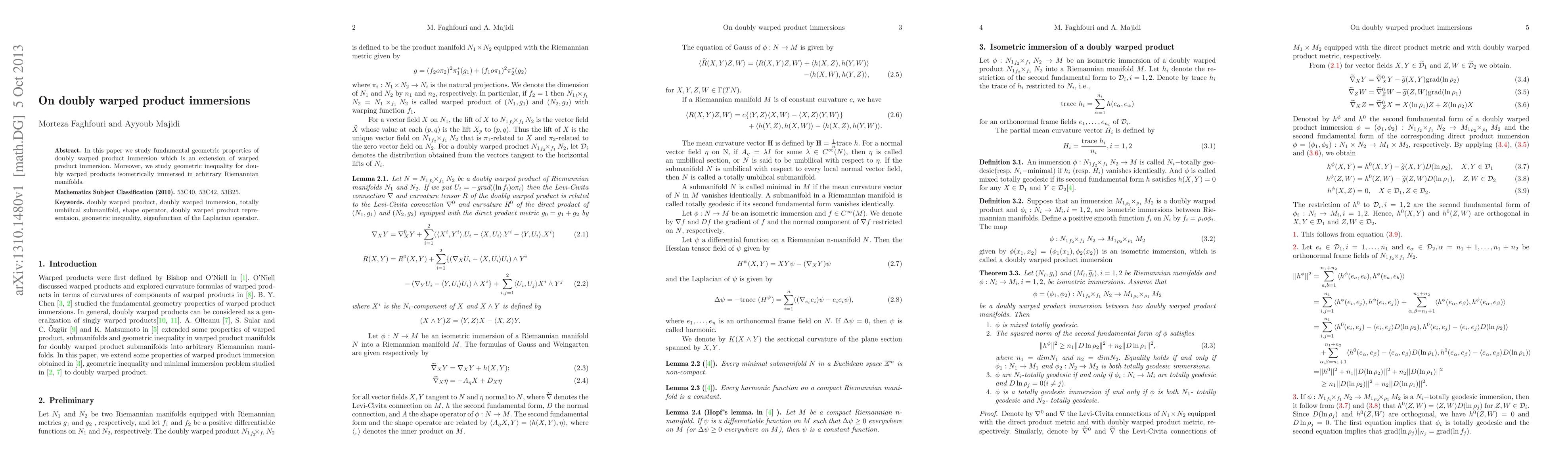 In this paper we study fundamental geometric properties of doubly warped product immersion which is an extension of warped product immersion. Moreover, we study geometric inequality for doubly warped products isometrically immersed in arbitrary Riemannian manifolds.