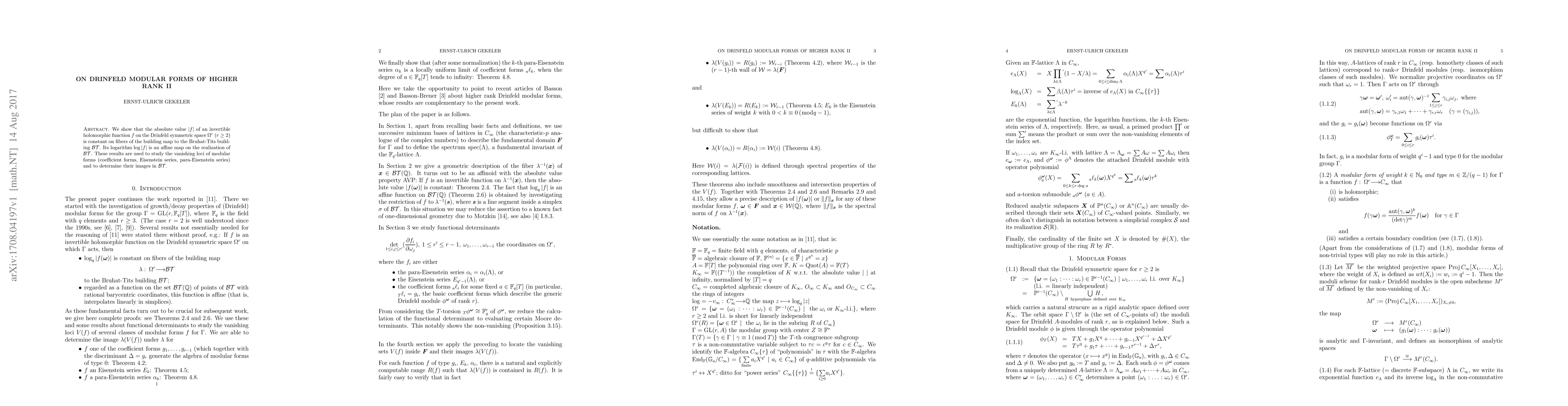 We show that the absolute value $|f|$ of an invertible holomorphic function $f$ on the Drinfeld symmetric space $\OM^r$ $(r \geq 2)$ is constant on fibers of the building map to the Bruhat-Tits building $\MB\MT$. Its logarithm $\log|f|$ is an affine map on the realization of $\MB\MT$. These results are used to study the vanishing loci of modular forms (coefficient forms, Eisenstein series, para-Eisenstein series) and to determine their images in $\MB\MT$.