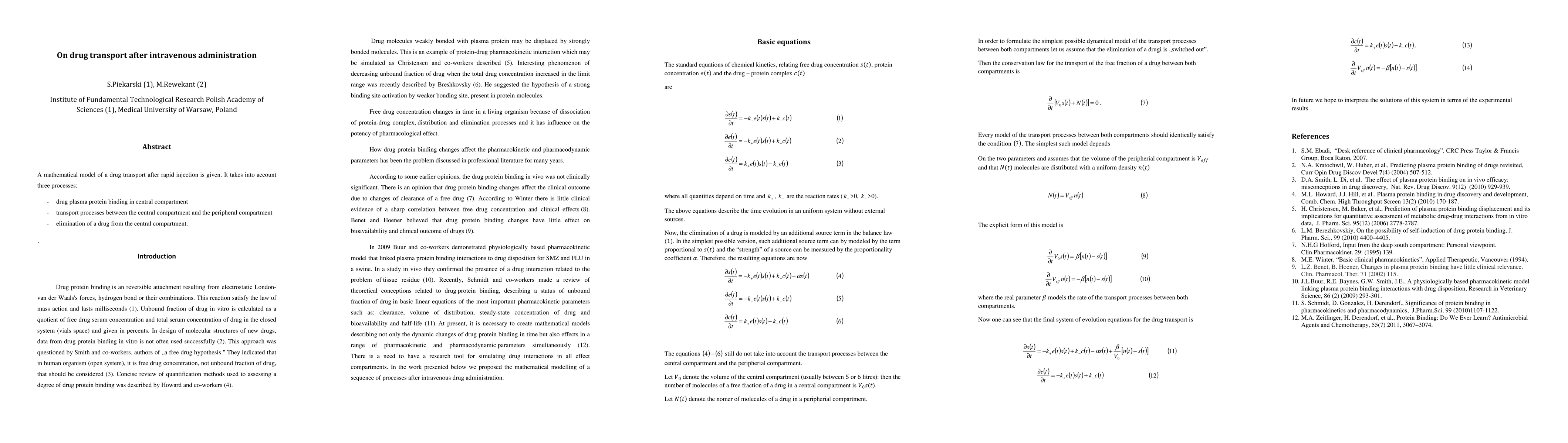 A mathematical model of a drug transport after rapid injection is given. It takes into account three processes: - drug plasma protein binding in central compartment - transport processes between the central compartment and the peripheral compartment - elimination of a drug from the central compartment. .