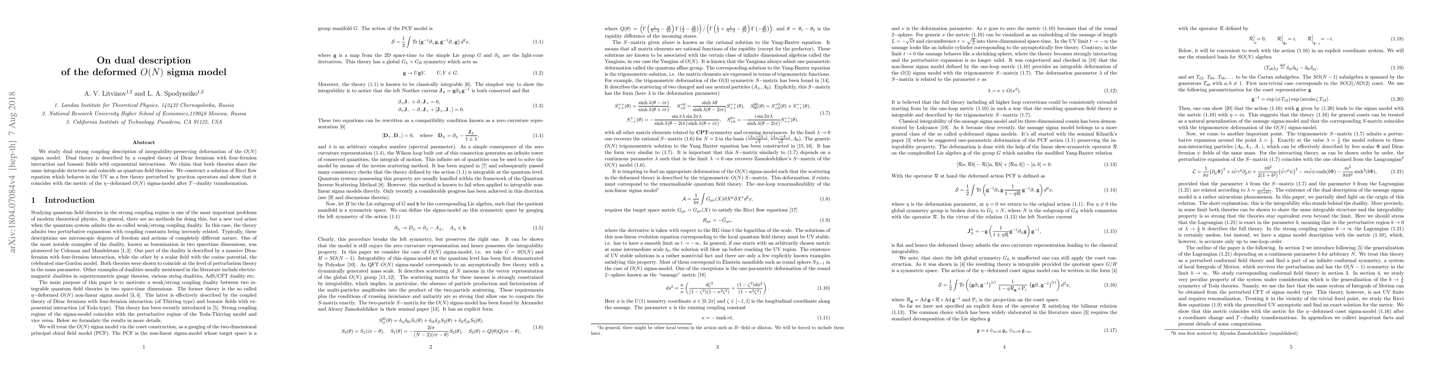 This paper explores the dual strong coupling description of an integrability-preserving deformation of the $O(N)$ sigma model, showing that it is equivalent to a coupled theory of Dirac fermions and bosonic fields. The authors demonstrate that both theories share the same integrable structure and coincide as quantum field theories, supported by a solution of the Ricci flow equation.