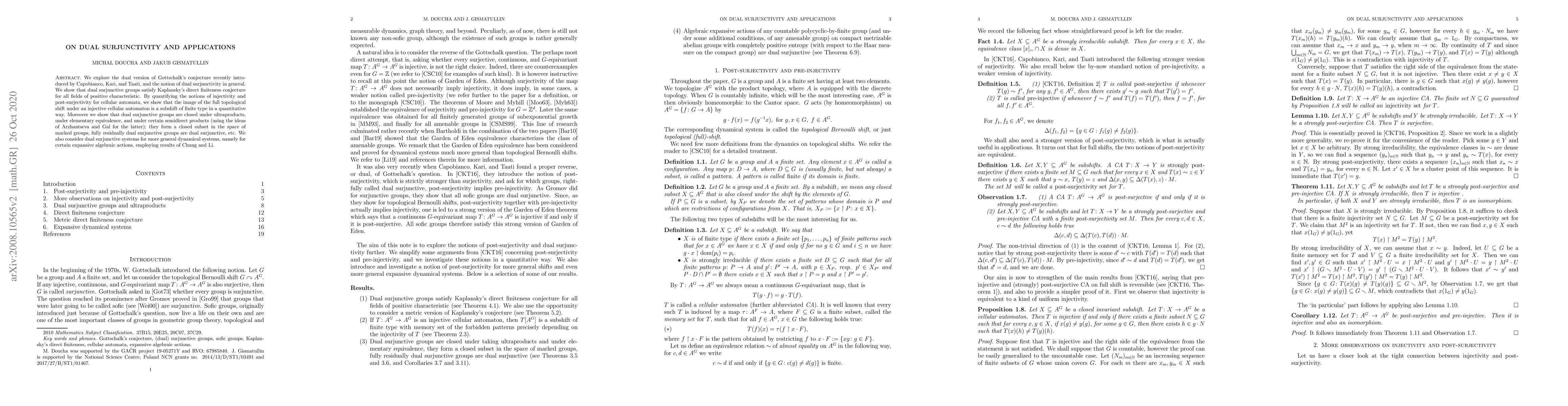We explore the dual version of Gottschalk's conjecture recently introduced by Capobianco, Kari, and Taati, and the notion of dual surjunctivity in general. We show that dual surjunctive groups satisfy Kaplansky's direct finiteness conjecture for all fields of positive characteristic. By quantifying the notions of injectivity and post-surjectivity for cellular automata, we show that the image of the full topological shift under an injective cellular automaton is a subshift of finite type in a quantitative way. Moreover we show that dual surjunctive groups are closed under ultraproducts, under elementary equivalence, and under certain semidirect products (using the ideas of Arzhantseva and Gal for the latter); they form a closed subset in the space of marked groups, fully residually dual surjunctive groups are dual surjunctive, etc. We also consider dual surjunctive systems for more general dynamical systems, namely for certain expansive algebraic actions, employing results of Chung and Li.