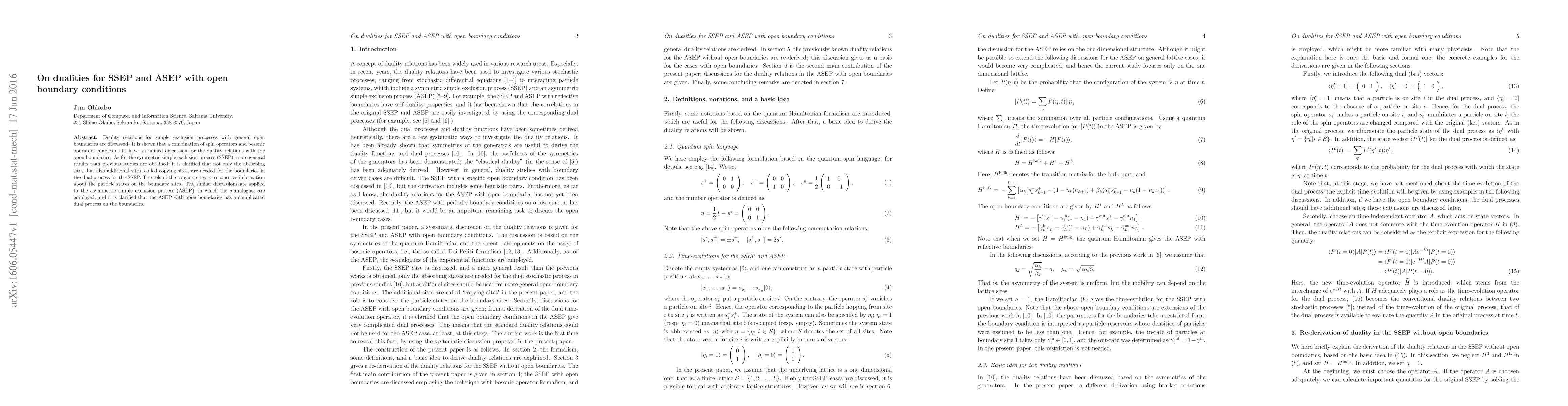 This paper explores dualities for simple exclusion processes (SSEP) and asymmetric simple exclusion processes (ASEP) with open boundary conditions, revealing that spin and bosonic operators provide a unified framework. For SSEP, it identifies the necessity of copying sites in addition to absorbing sites for dual boundary conditions to conserve particle state information.