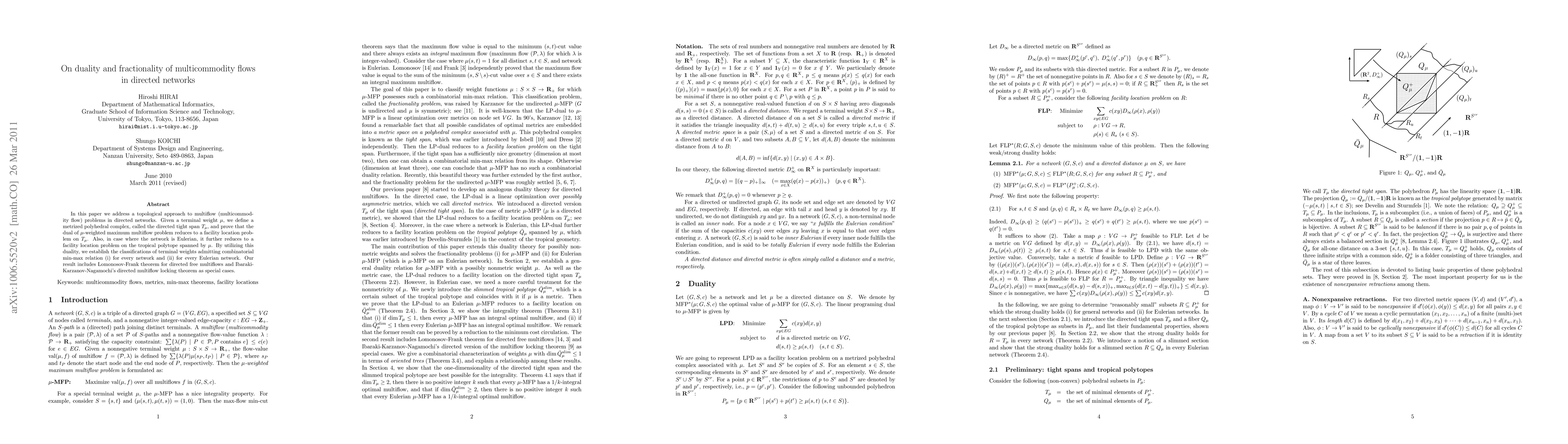 This paper explores the duality and fractionality of multicommodity flows in directed networks, establishing that the dual of a $\mu$-weighted maximum multiflow problem reduces to a facility location problem on the directed tight span $T_{\mu}$. For Eulerian networks, it further simplifies to a facility location problem on the tropical polytope spanned by $\mu,$ leading to classifications of terminal weights with combinatorial min-max relations.