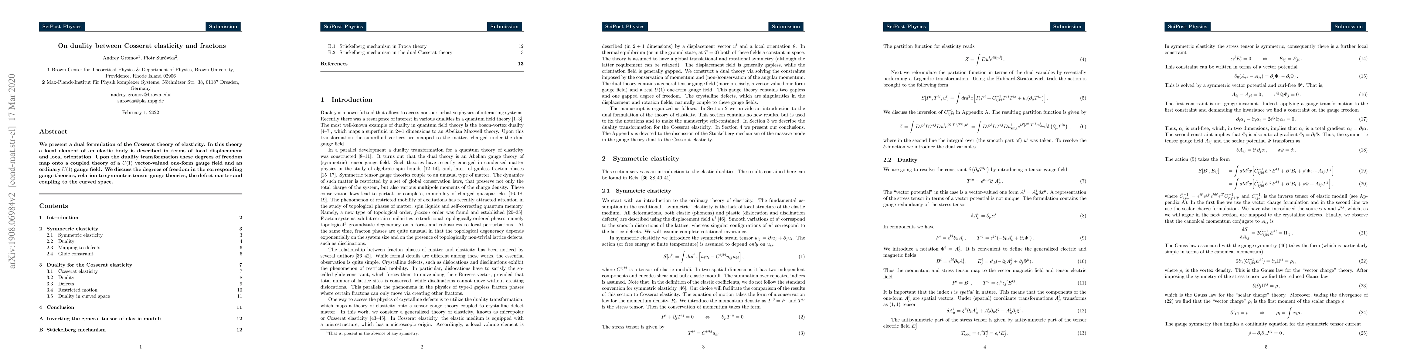 This paper introduces a dual formulation of Cosserat elasticity, mapping local displacement and orientation to a coupled theory involving a vector-valued one-form gauge field and a $U(1)$ gauge field, and discusses the resulting degrees of freedom, defect matter, and interactions with curved space.